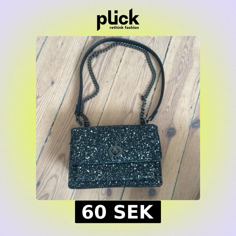 Snygg svart axelväska med glittrigt mönster och kedjedetaljer. Väskan har en praktisk storlek med flera fack inuti och en vridlåsning framtill. Perfekt för att ge en extra touch till din outfit. Använd 1-3 gånger