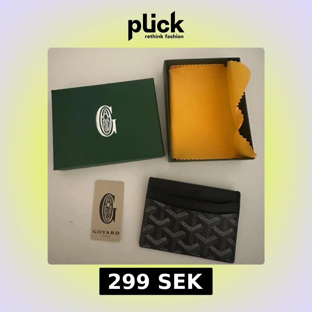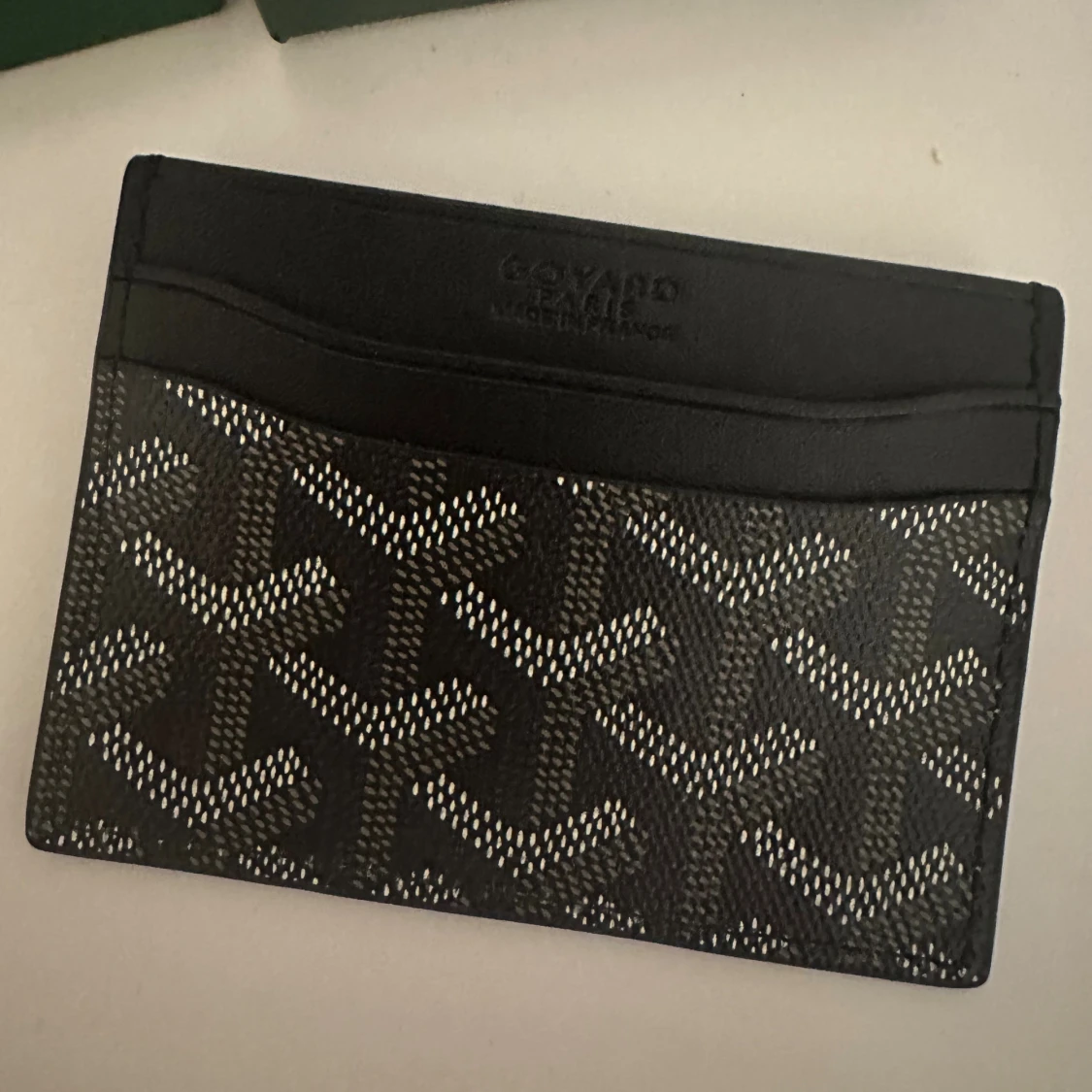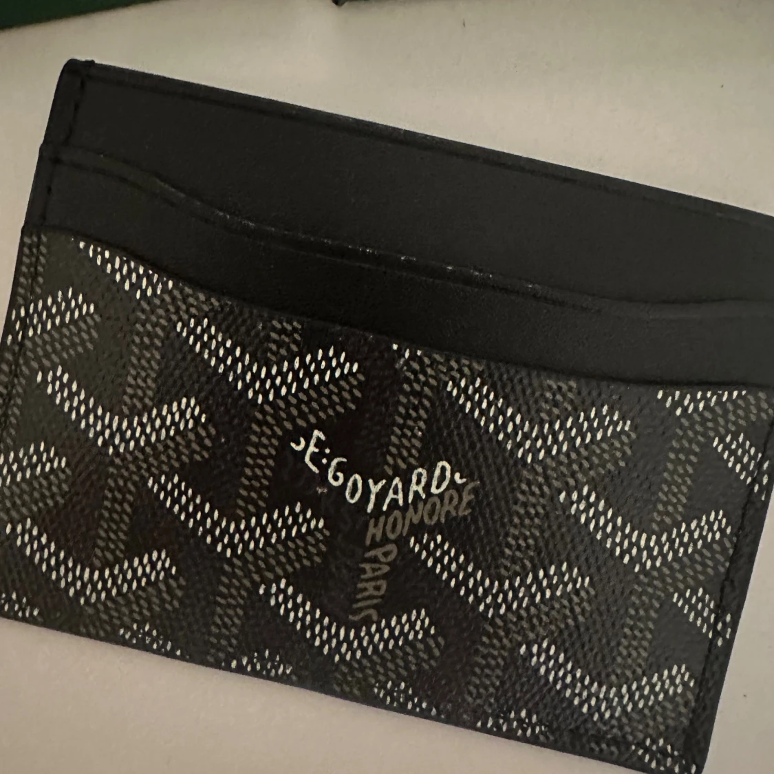 Exklusiv svart korthållare från Goyard med ikoniskt mönster och diskret logga. Tillverkad i skinn med flera fack för kort. Kommer med originalask och tygpåse. Perfekt accessoar för dig som vill ha stilren och lyxig känsla i vardagen.