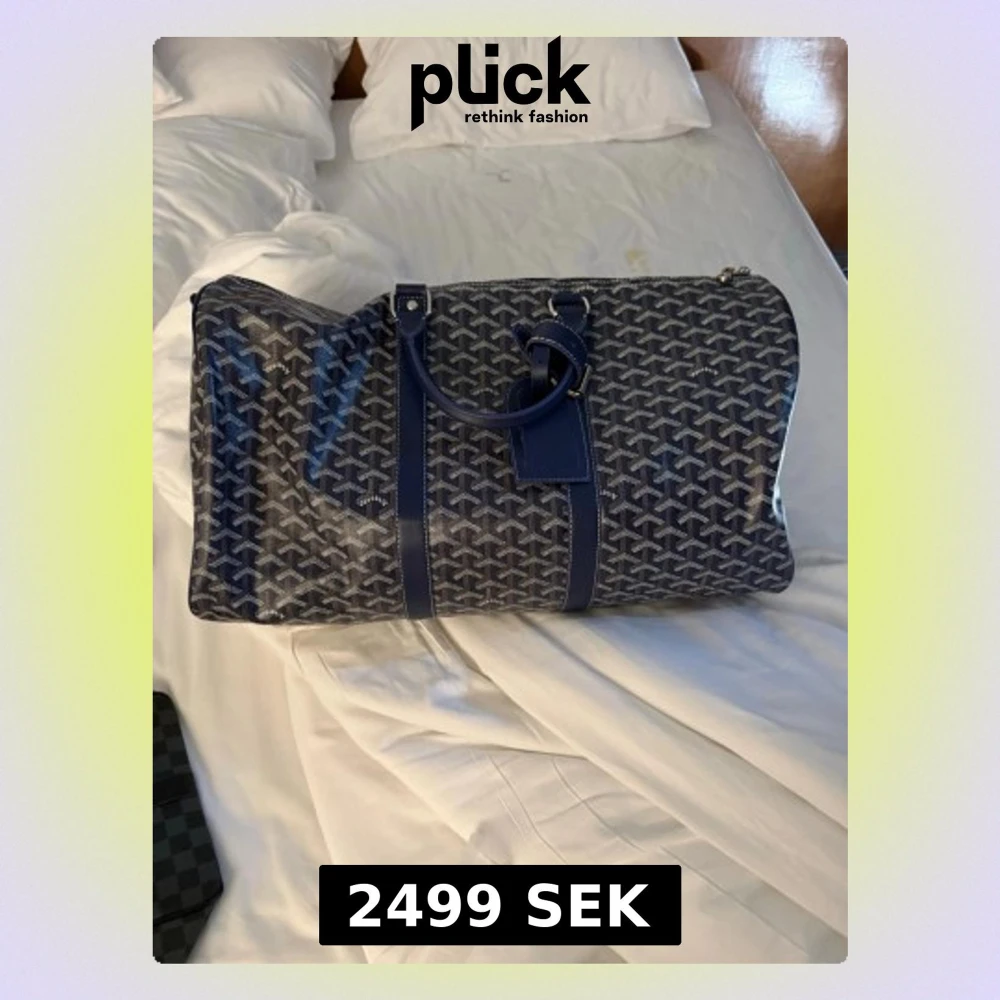 Säljer en stor och rymlig blå resväska från Goyard med deras ikoniska grafiska mönster. Väskan har två handtag, detaljer i blått skinn och dragkedja upptill. Perfekt för weekendresor och har en riktigt snygg och unik look.