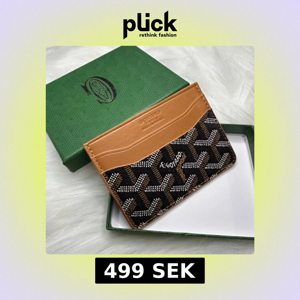 Säljer ett stilrent kortfodral i brunt och svart med ett ikoniskt mönster. Fodralet har flera kortfack och en snygg gul insida. Perfekt för att hålla dina kort organiserade med stil.