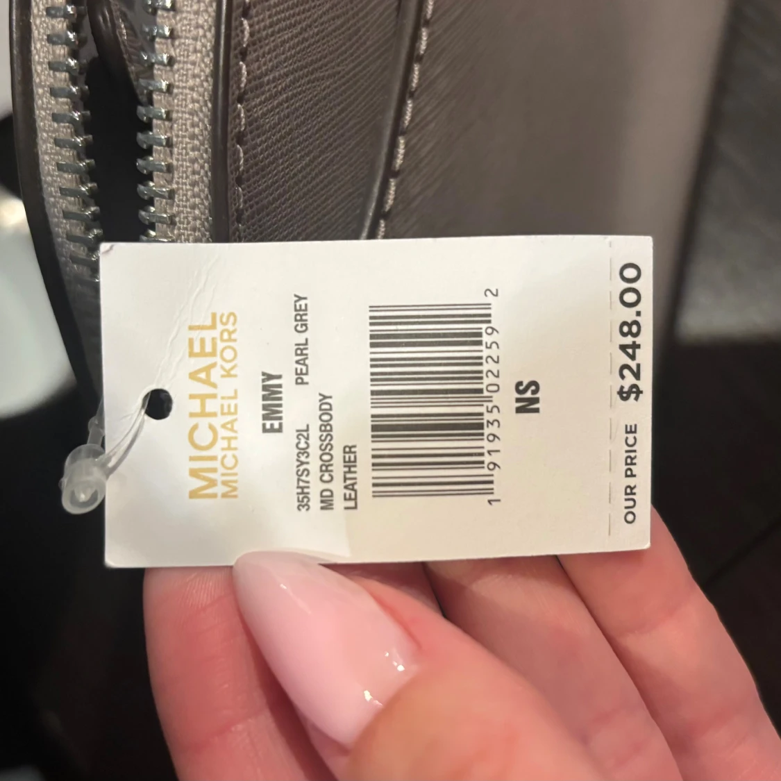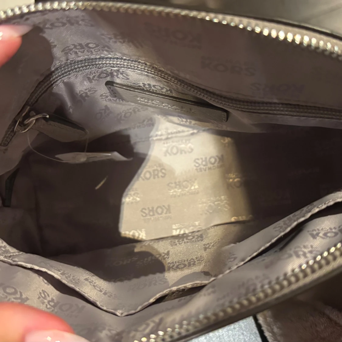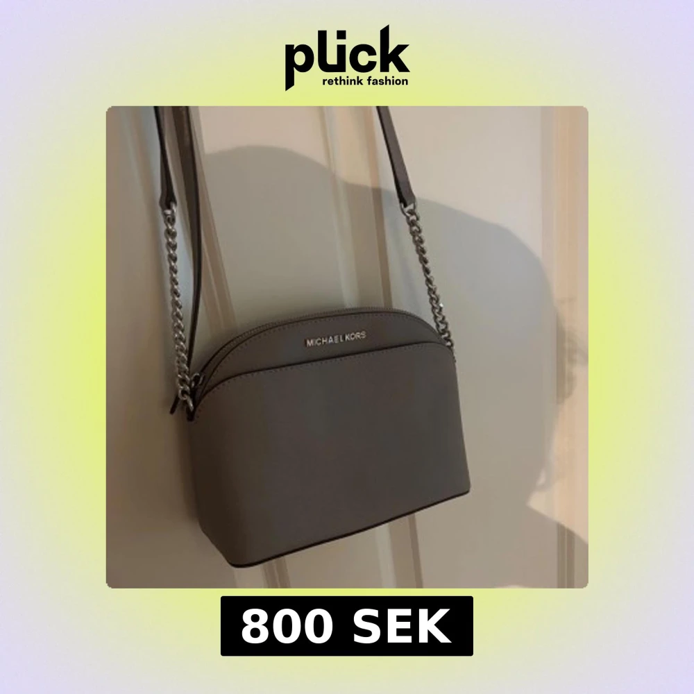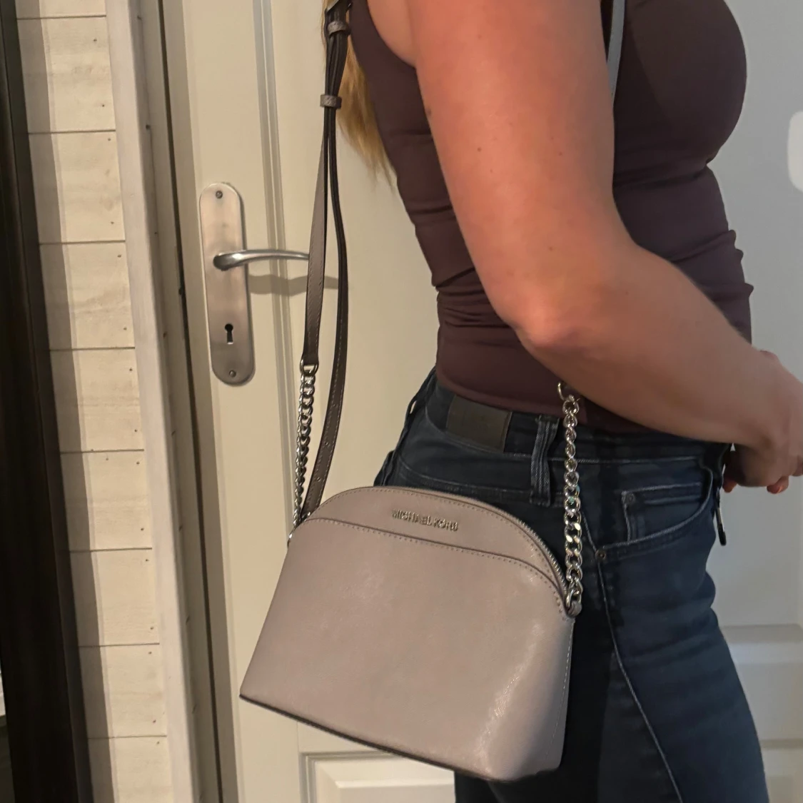 Snygg grå axelväska från Michael Kors med stilren, rundad form och silverfärgad kedja på axelremmen.