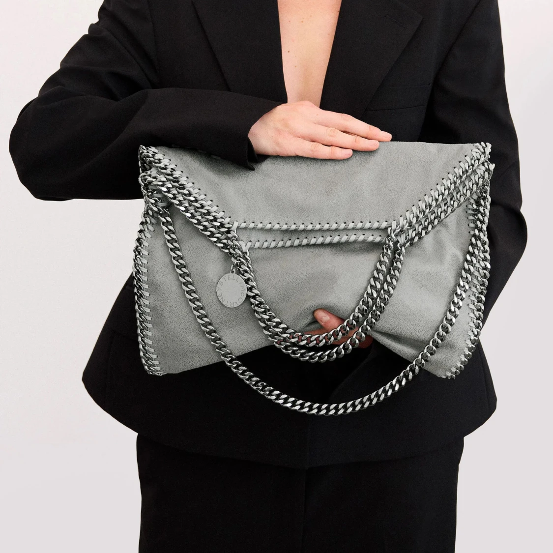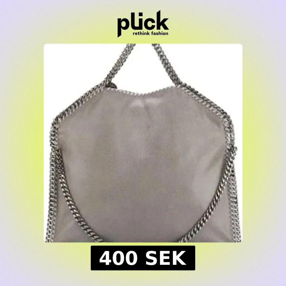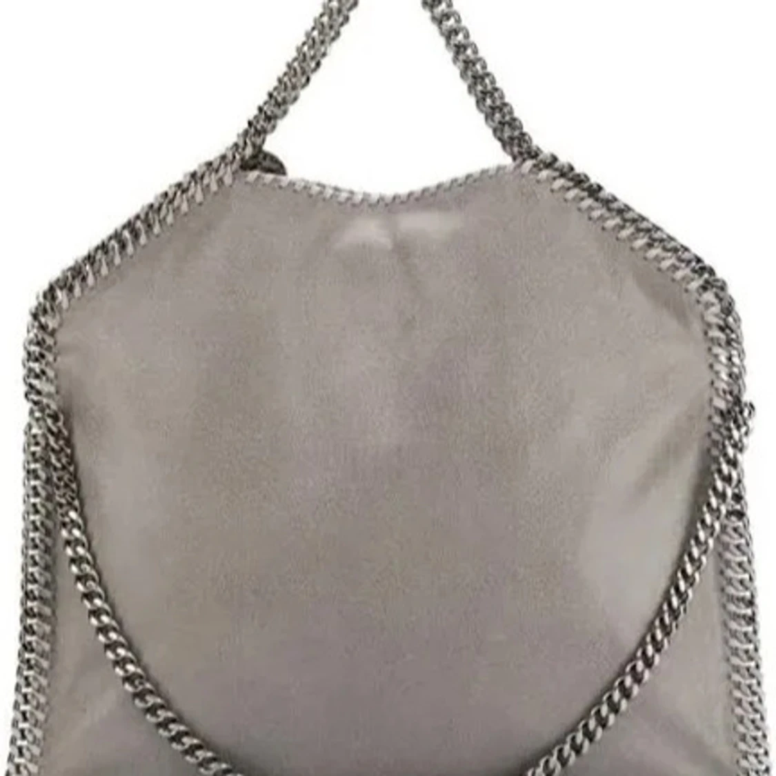 Snygg grå axelväska från Stella McCartney i mjuk mocka med kraftiga silverfärgade kedjor längs kanterna och som axelrem. Väskan har en cool, modern look och rundad form, perfekt för dig som vill sticka ut med en statementväska.