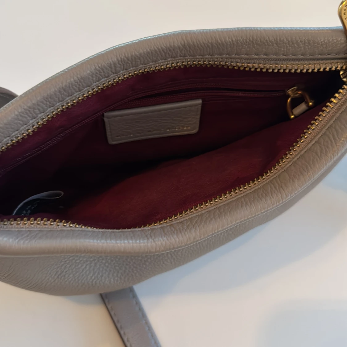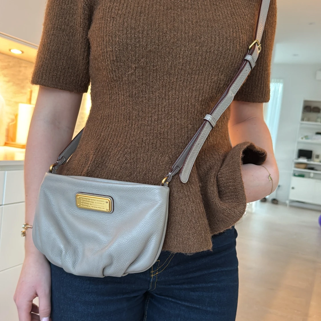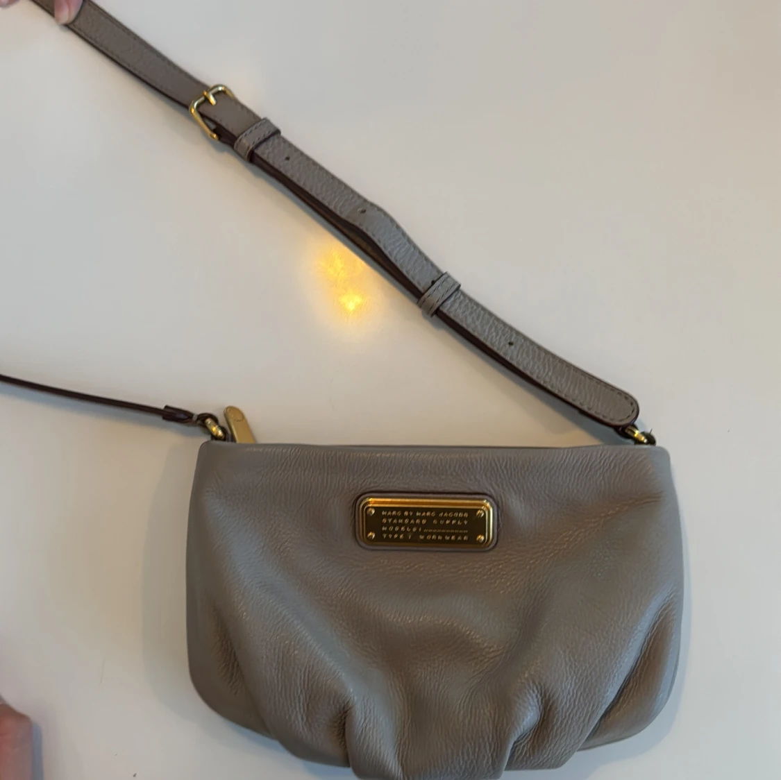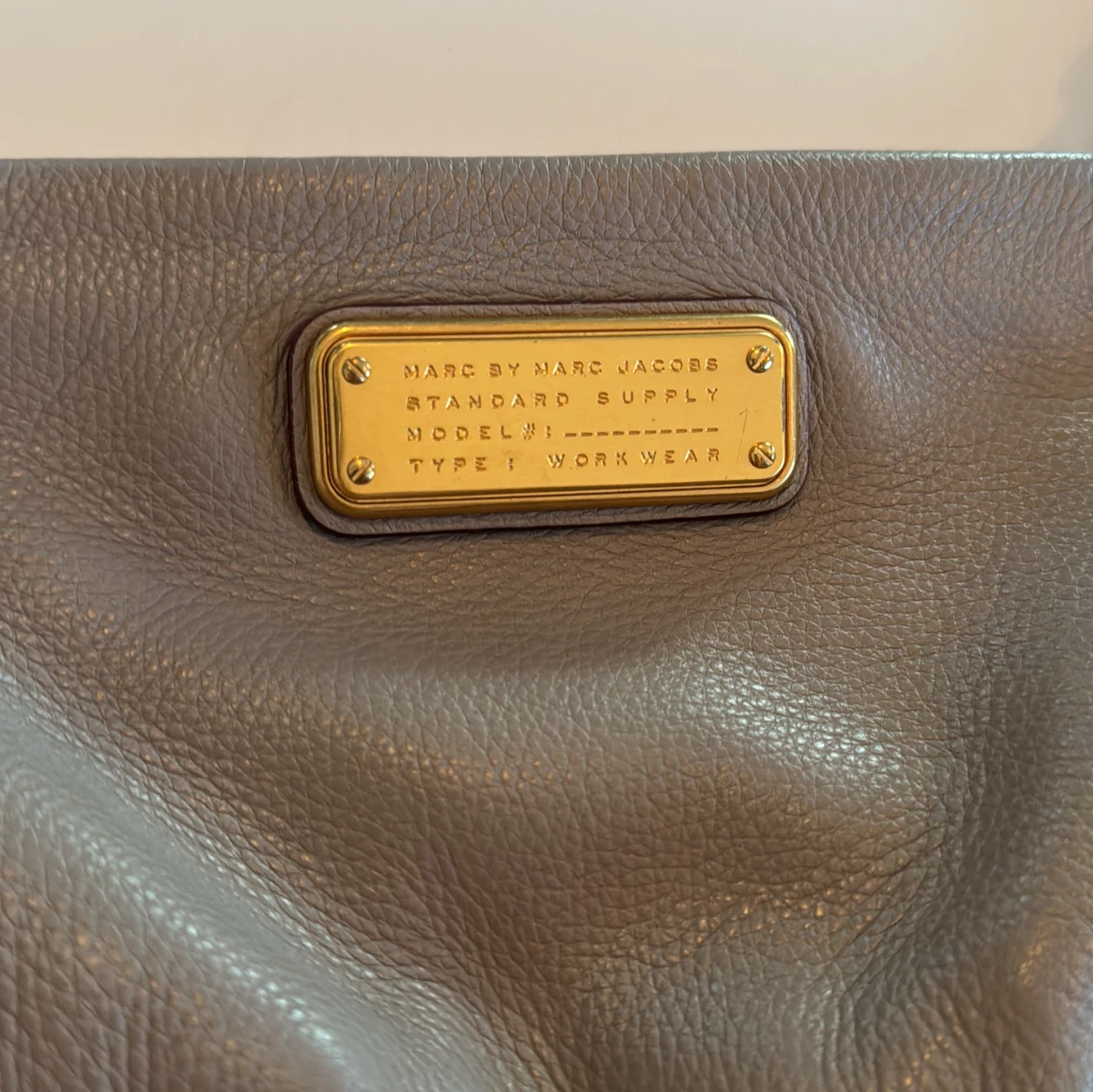 Snygg trendig grå axelväska från Marc by Marc Jacobs i mjukt skinn. Väskan har justerbar rem, guldfärgad metallplatta framtill och dragkedja upptill. Perfekt storlek för det viktigaste och passar till många olika outfits. Väska som är i nyskick!