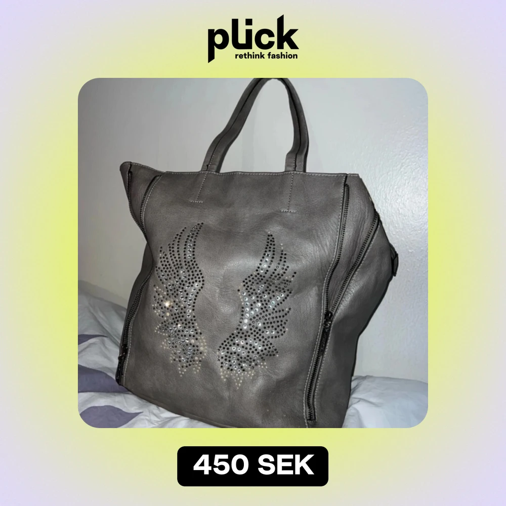 Säljer en snygg grå axelväska i skinn med gulliga glitter pluppar i form av vingar på framsidan. Väskan har dragkedjor på sidorna och ett rymligt inre med flera fack. Perfekt för både vardag och fest! Väl använd