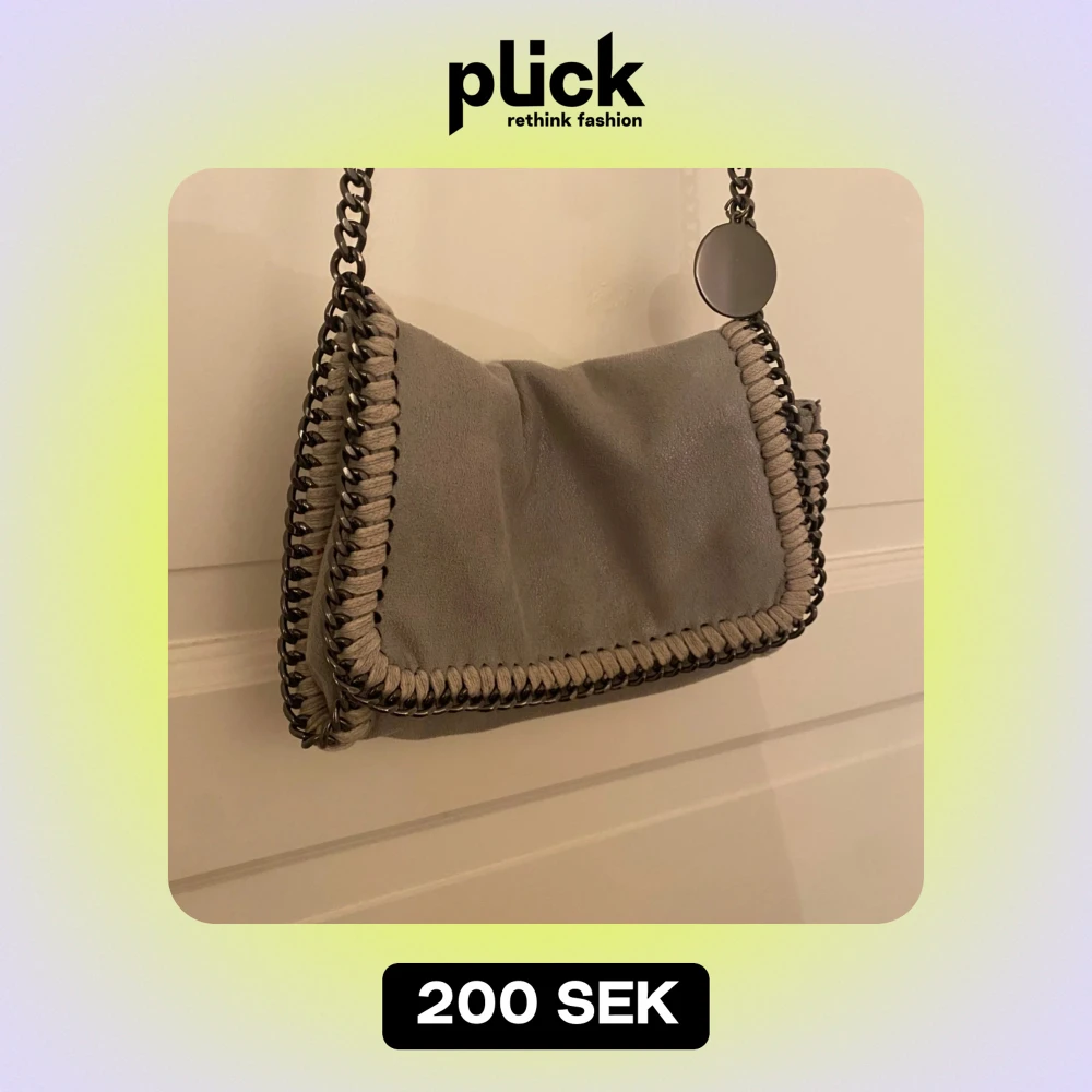 En praktisk och lite mindre handväska i mocka med supersnygga kedjedetaljer som liknar Stella McCartney väskorna. Köpt här på plick men har inte används supermycket, så skicket är fortfarande gott!💕