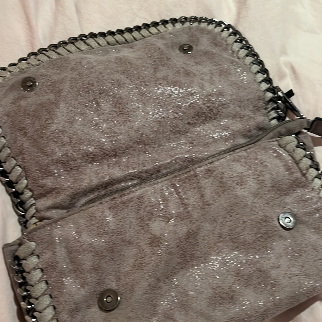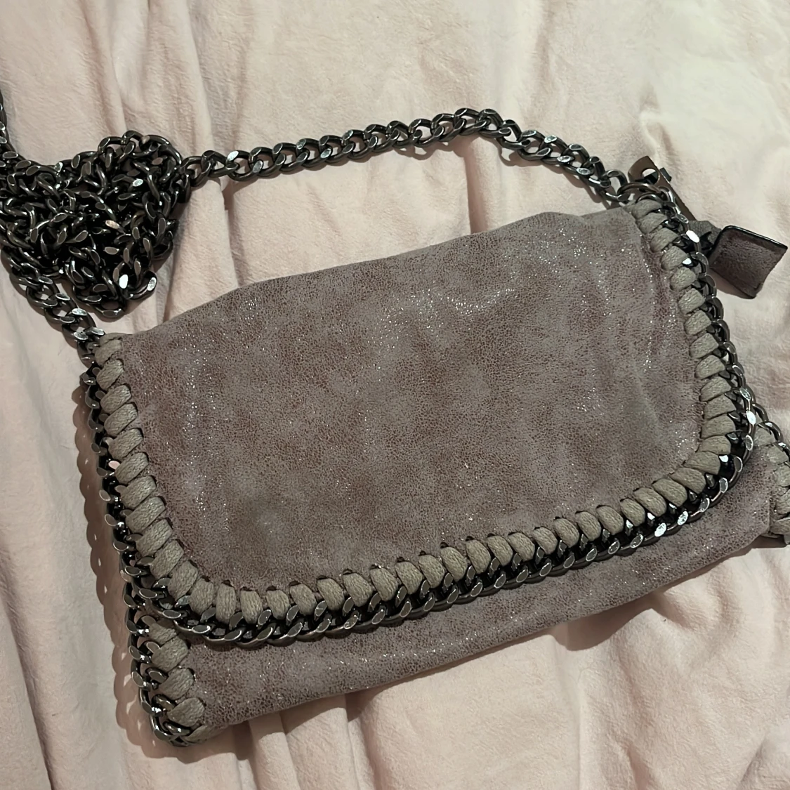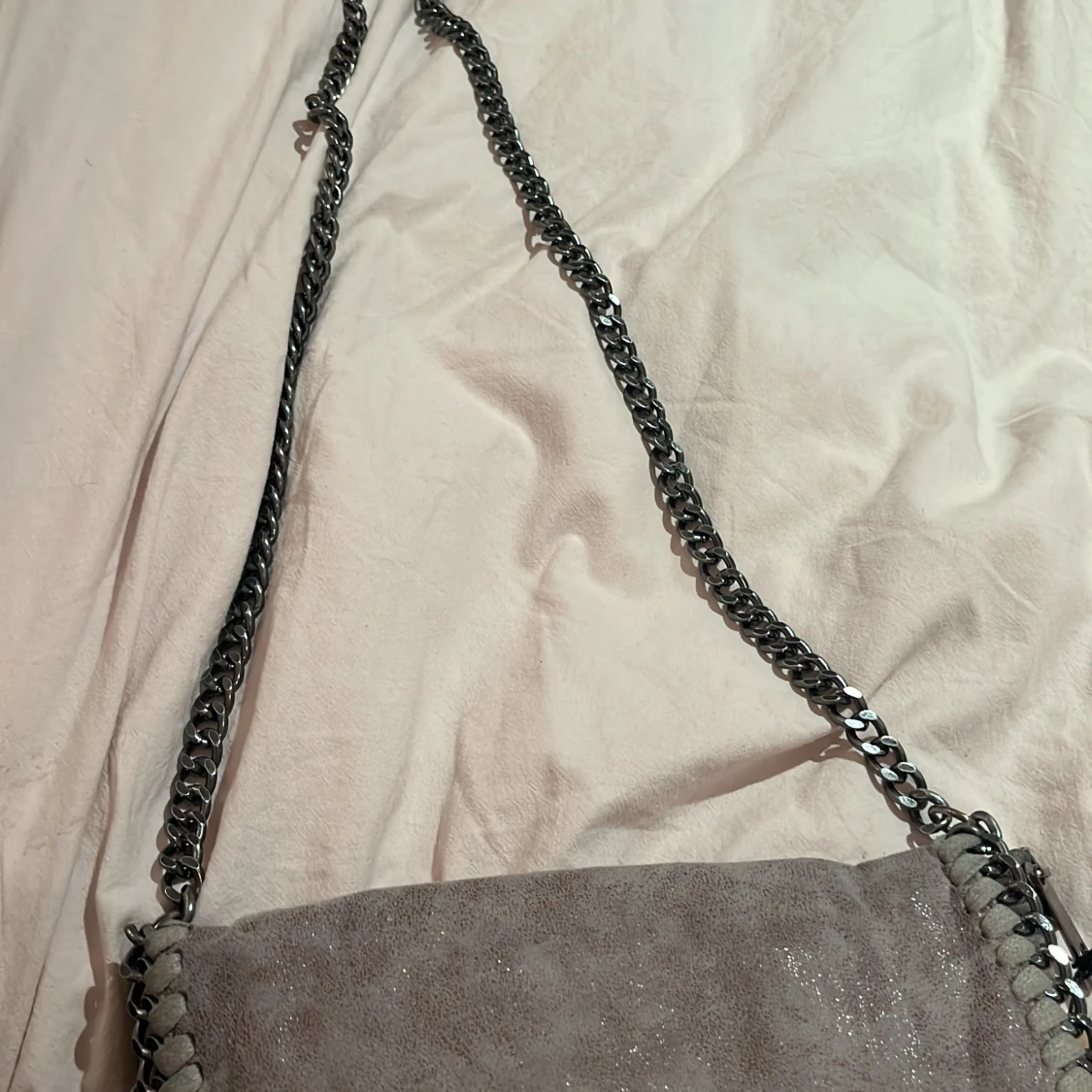 Snygg grå axelväska i mocka med glittrig yta och kedjedetaljer. Väskan har en lång kedjerem och stängs med magnetknappar. Perfekt för att ge din outfit en edgy touch.