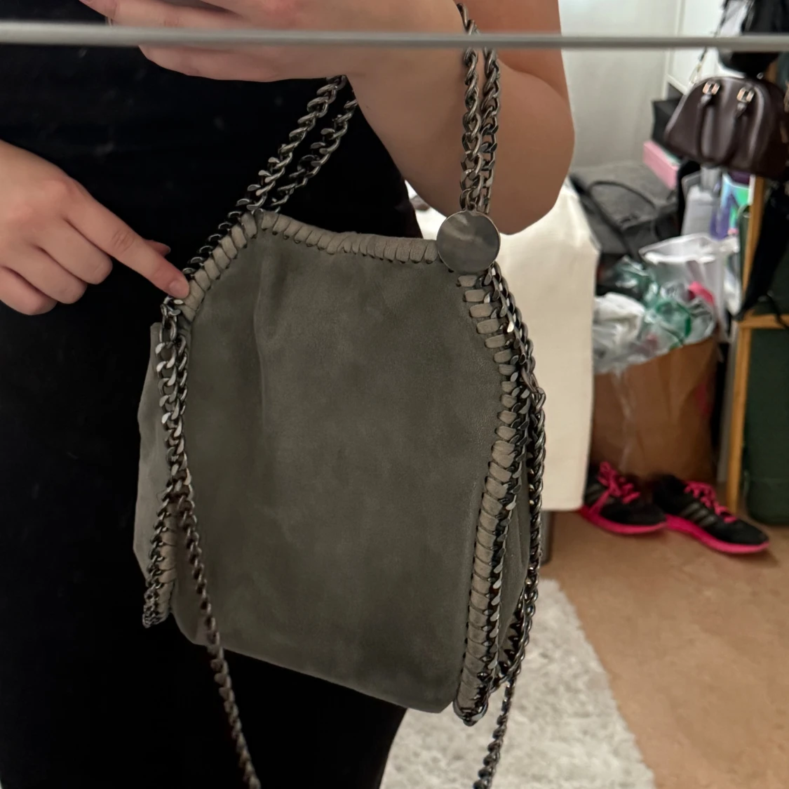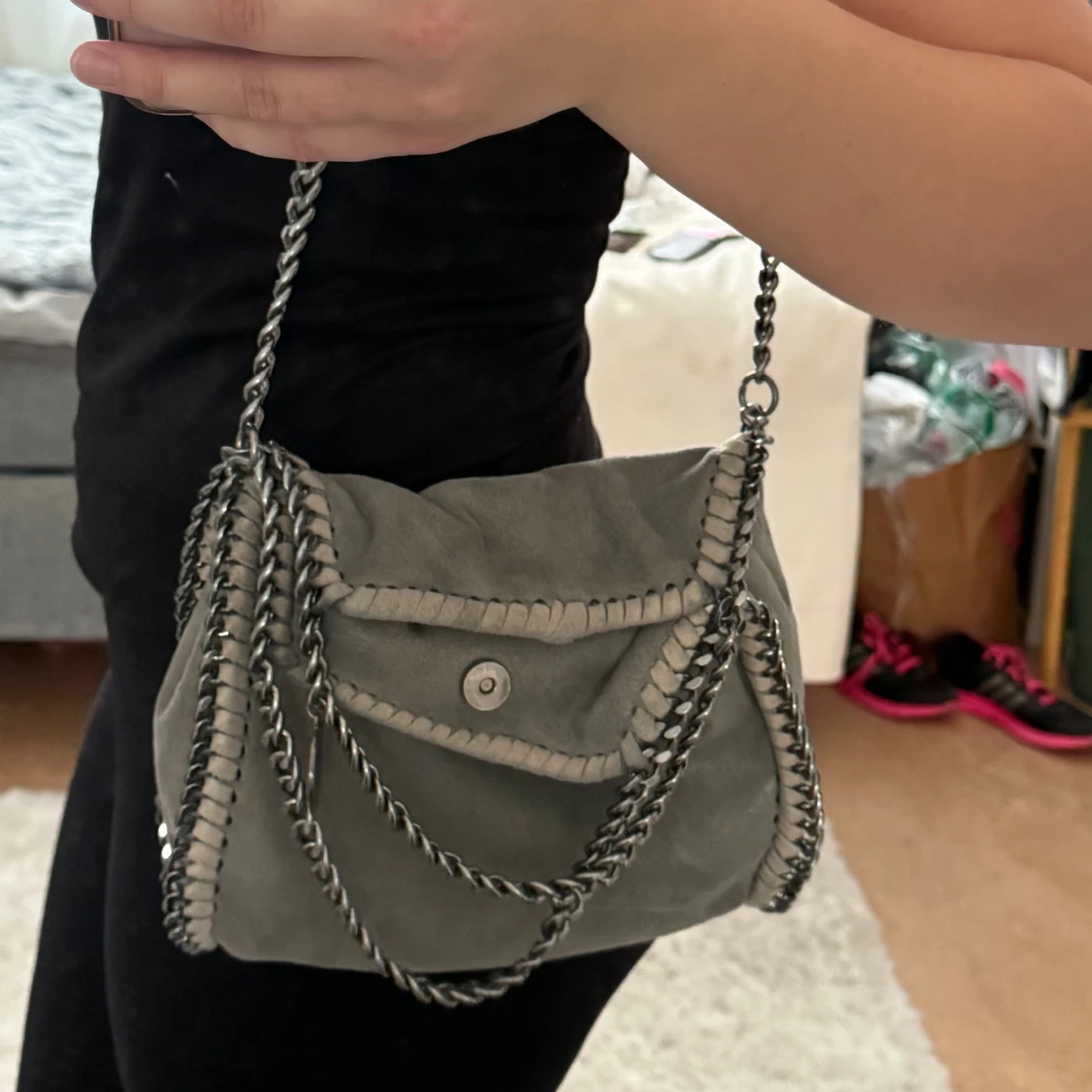 Snygg grå axelväska i mocka med grova silverfärgade kedjor längs kanterna och som axelrem. Väskan har ett lock med knappstängning och dekorativa sömmar runt om. Perfekt storlek för det viktigaste och ger en cool vibe till din outfit.
