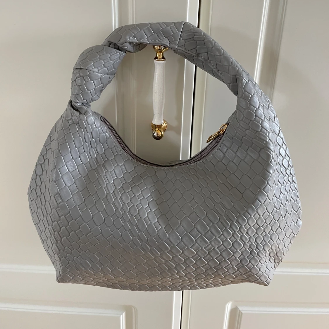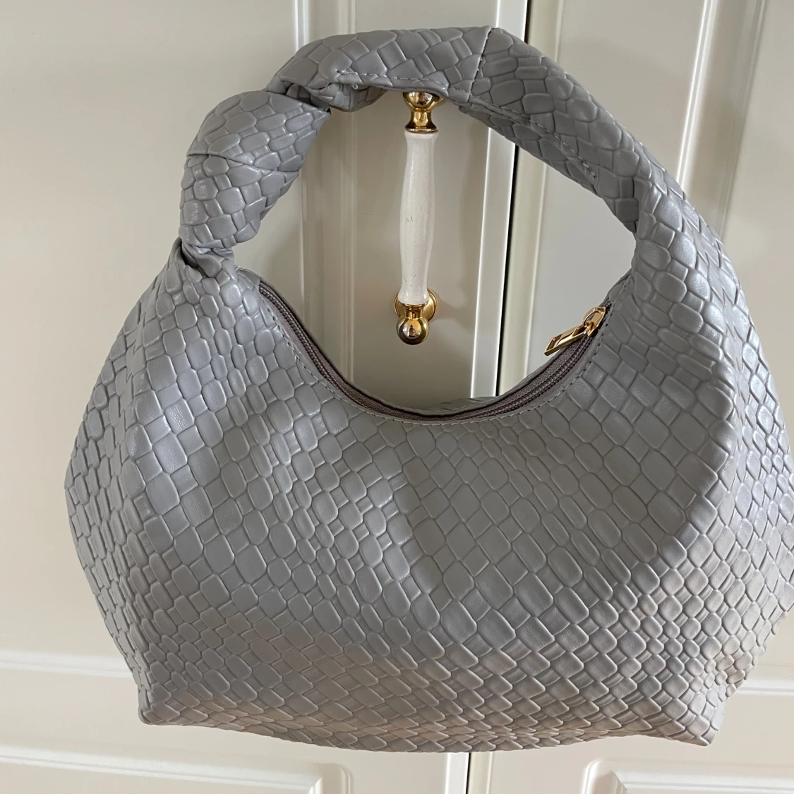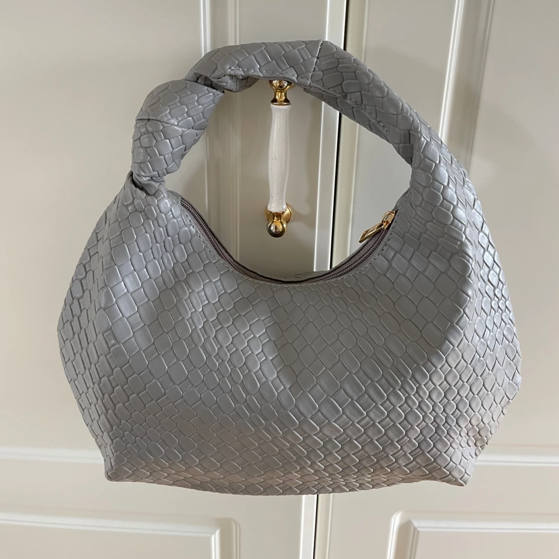 Snygg grå axelväska med coolt reptilmönster och en unik knut på handtaget. Väskan har en mjuk, rundad form och stängs med dragkedja i guld. Perfekt storlek för att få plats med allt du behöver. Materialet är syntet och ger en lyxig känsla.