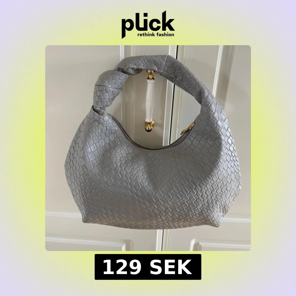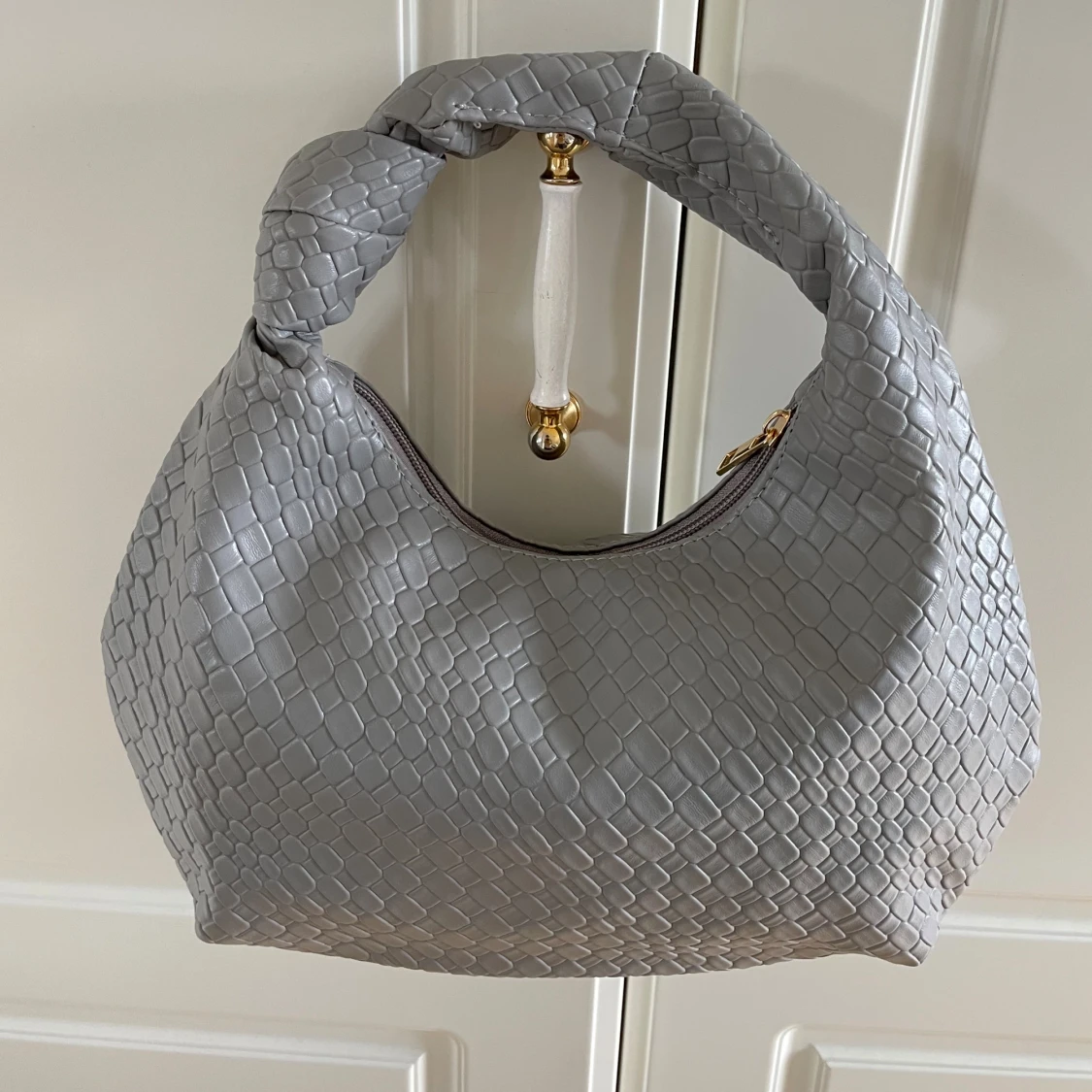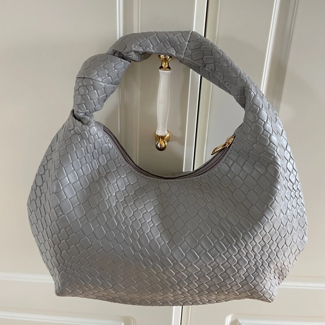 Snygg grå axelväska med coolt reptilmönster och en unik knut på handtaget. Väskan har en mjuk, rundad form och stängs med dragkedja i guld. Perfekt storlek för att få plats med allt du behöver. Materialet är syntet och ger en lyxig känsla.