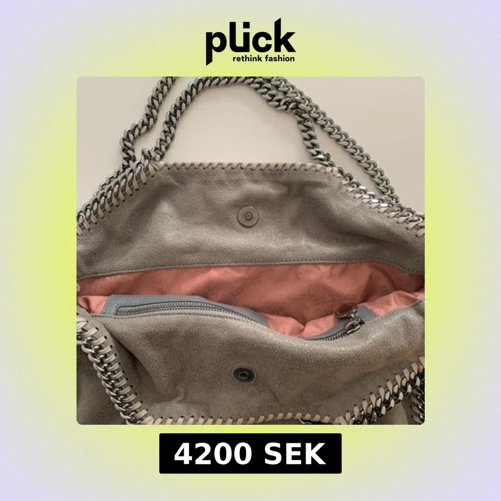 Säljer en Fallabella veganskt grå axelväska från Stella McCartney med kedjedetaljer runt kanterna och som axelrem. Väskan har ett rosa innerfoder, magnetlås och dragkedjefack. Oanvänd