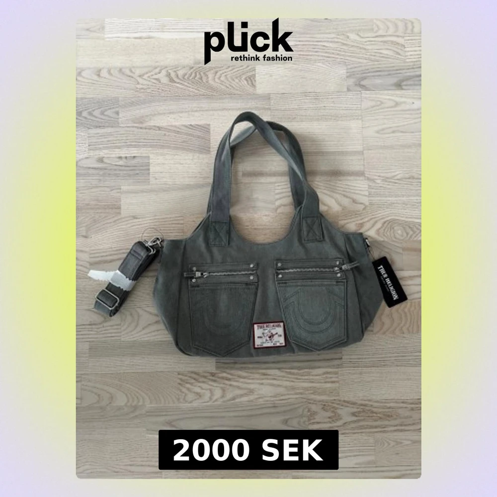 Snygg grå axelväska från True Religion i jeansmaterial med fickdetaljer och silverfärgade dragkedjor framtill. Väskan har breda handtag och en avtagbar axelrem. Helt ny med tag🩶