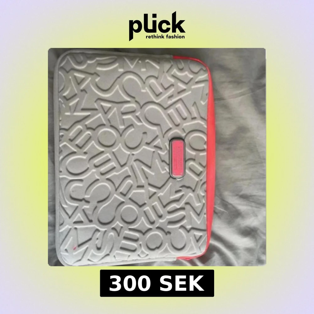 Säljer en grå datorväska från Marc by Marc Jacobs med upphöjt bokstavsmönster och röd dragkedja. Väskan har en platta med logga på framsidan och är tillverkad i syntetmaterial. Perfekt för att skydda din laptop med stil.