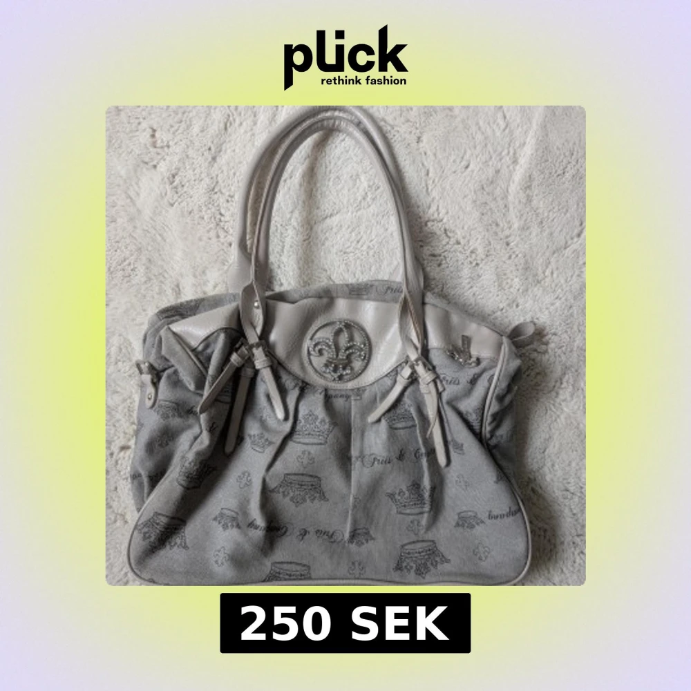 Snygg grå och rymligt handväska med mönster av kronor och text, detaljer i ljusgrått skinn och två rejäla handtag. Väskan har spännen framtill och en dekorativ emblem med strass. Perfekt för dig som gillar en unik och stilren look.