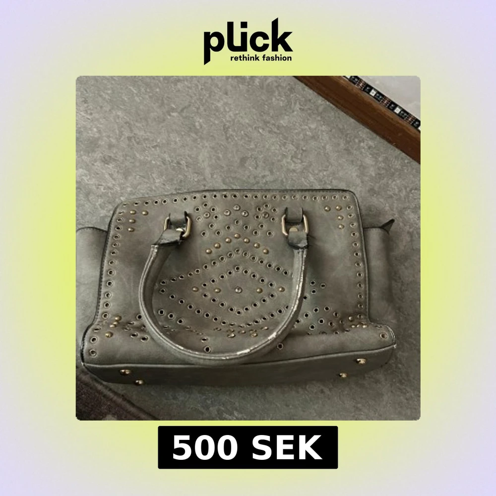 Snygg grå handväska med guldfärgade nitar i mönster på framsidan. Väskan har två stadiga handtag, dragkedja på baksidan och detaljer i metall. Tillverkad i syntetmaterial med en stilren, fyrkantig form. Passar för 90s stil.