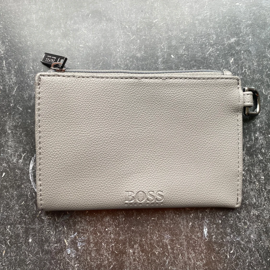 Stilren grå plånbok från BOSS i slätt skinn med diskret logga framtill. Praktisk dragkedja upptill och metallfäste i sidan för enkel användning. Perfekt för kort och kontanter, minimalistisk design som passar till allt.