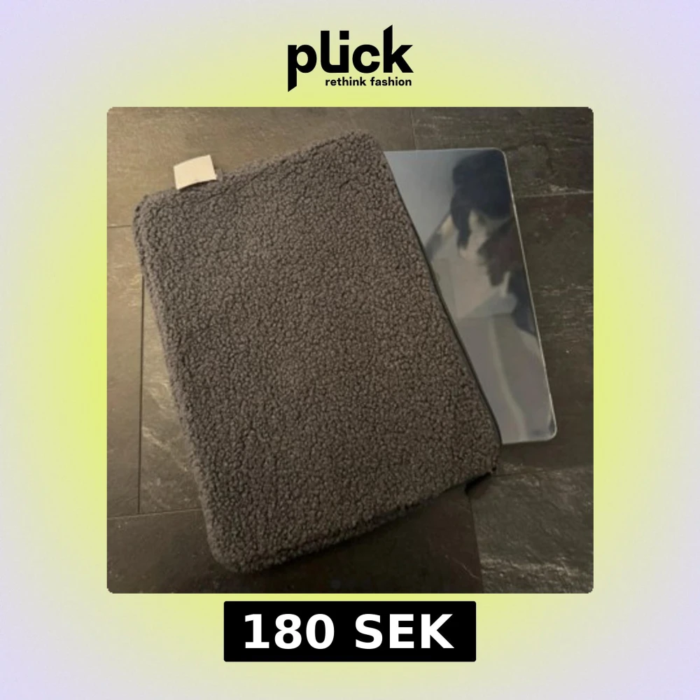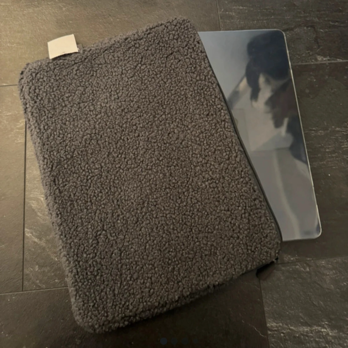 Mjuk och fluffig datorväska i mörkgrå fleece.
