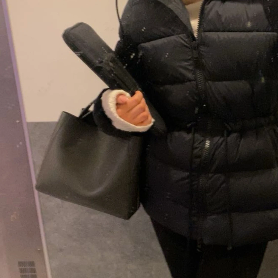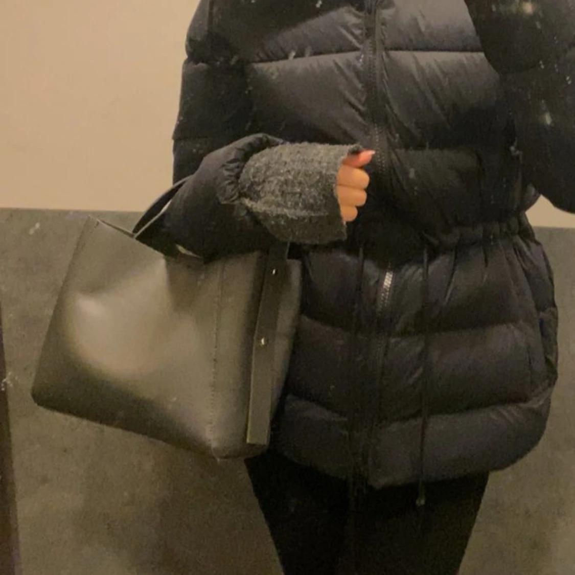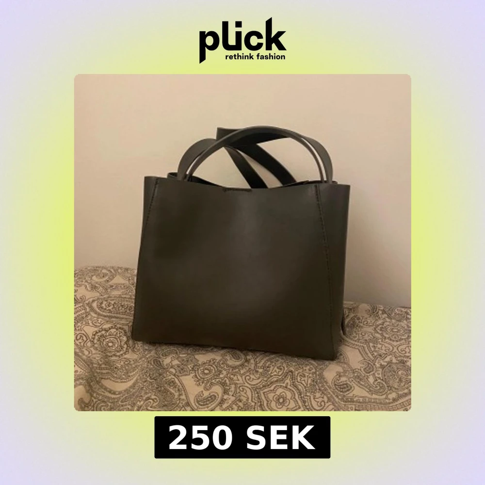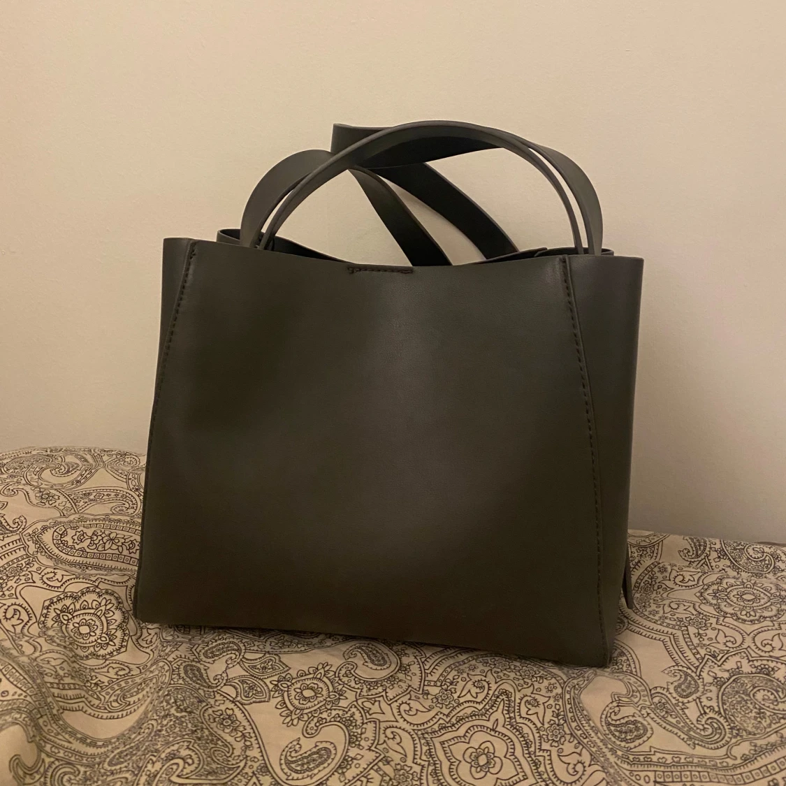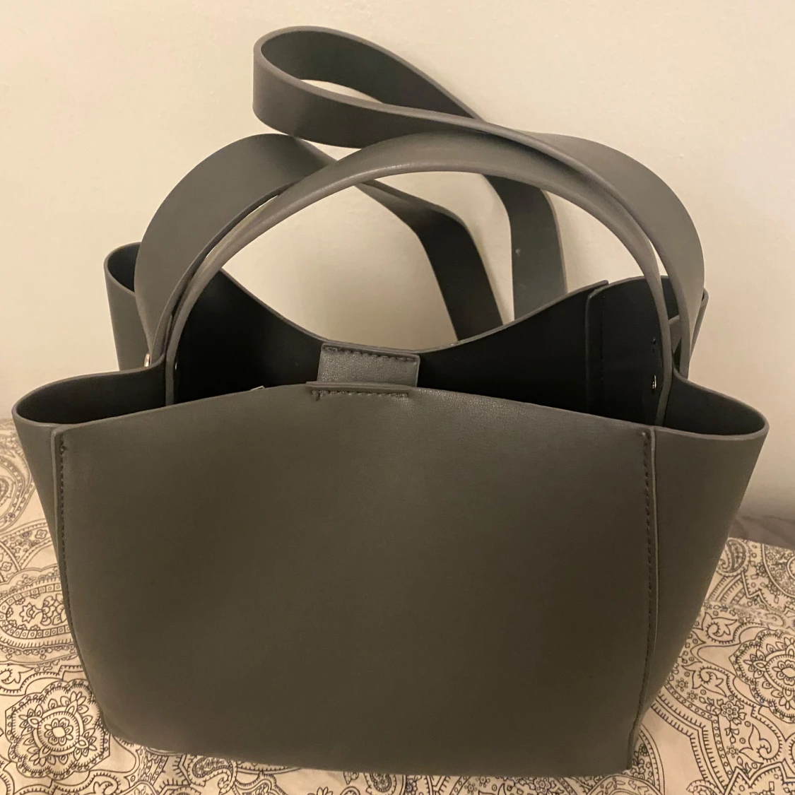 Grå rymlig väska från Gina Tricot mellan modellen tror jag om inte den lilla, den har ett långt band som sitter fast som du kan ha på axeln. 🌸