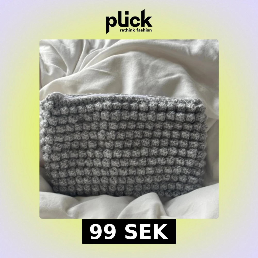 Superfin grå necessär med virkad bubbelstruktur och vit dragkedja. Insidan är fodrad med tyg som har små prickar. Perfekt för att bära småsaker eller använda som sminkväska. Unik och mysig accessoar som sticker ut i mängden.