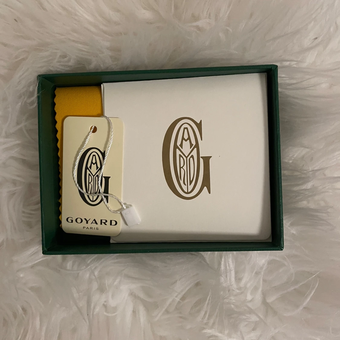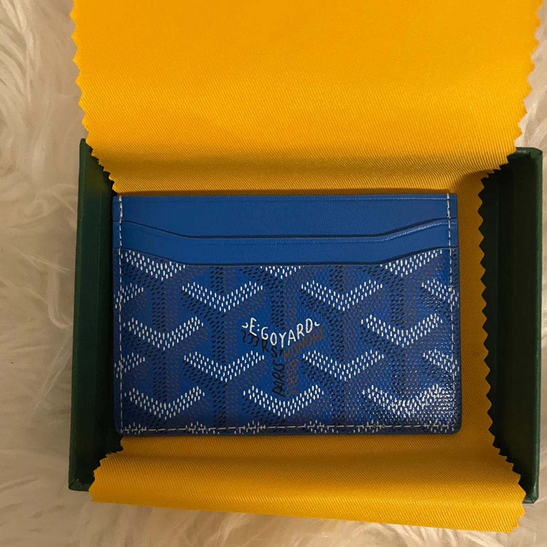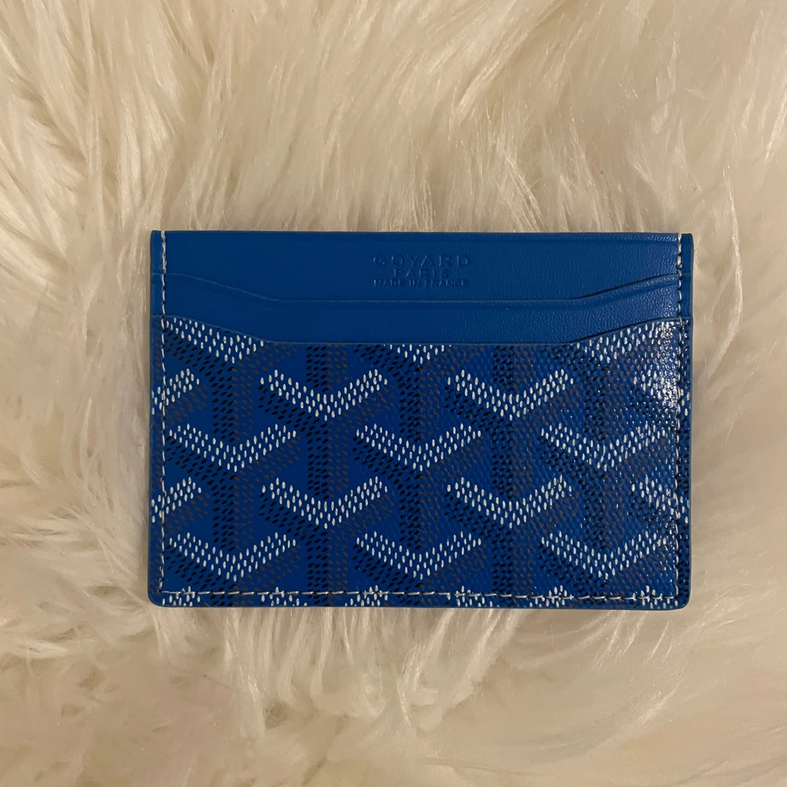Säljer en blå plånbok från Goy4rd med deras ikoniska grafiska mönster i vitt och svart. Plånboken är i smidig modell för kort och är tillverkad i skinn. Kommer med originalask, dustbag och kvitto. Perfekt accessoar för dig som gillar lyxiga detaljer.