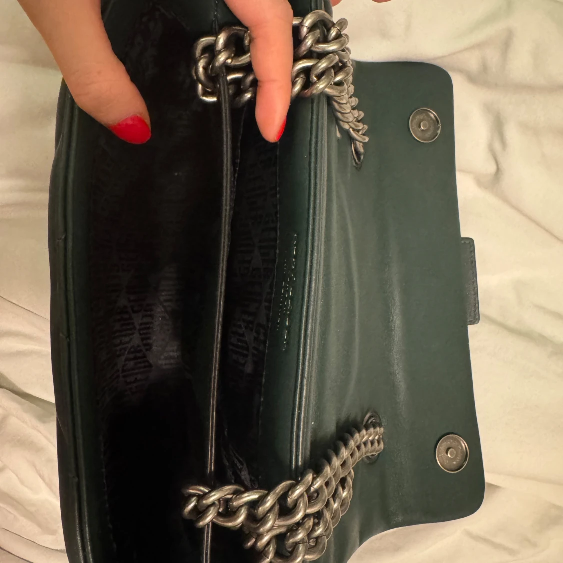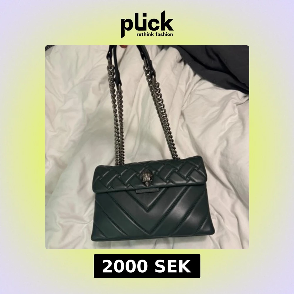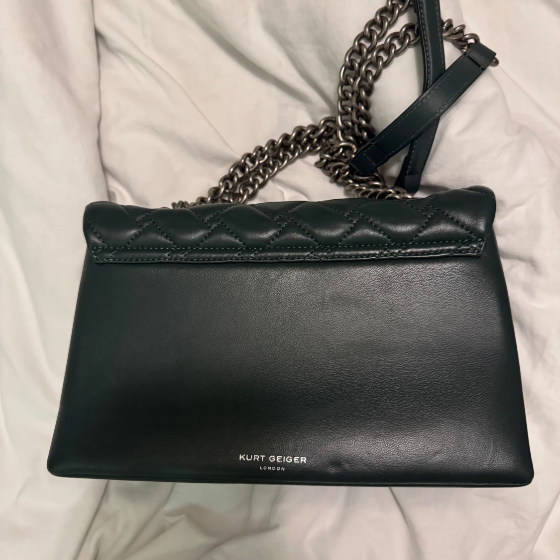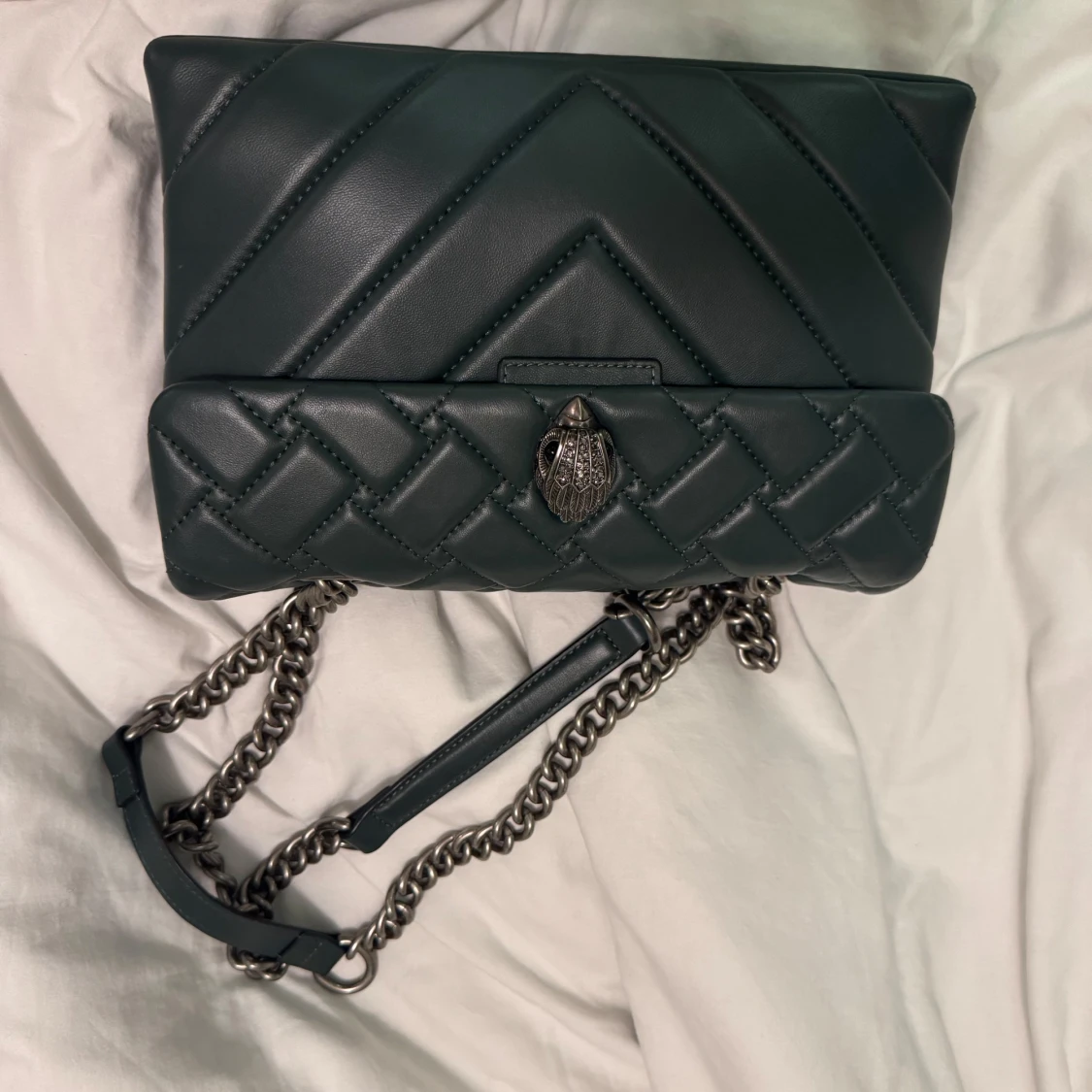 Snygg grön axelväska från Kurt Geiger med quiltad design och kedjeaxelrem. Färgen finns inte att köpa längre. Inga tecken på användning. Väldigt fint skick. Storlek medium