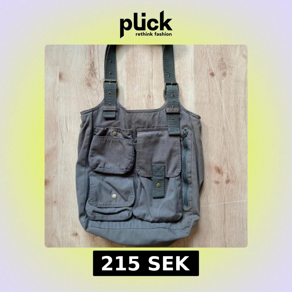 Rymlig axelväska i bomull med flera praktiska fickor framtill, både med tryckknappar och dragkedja. Justerbara axelband i grönt tyg och en stor öppen ficka på baksidan. Perfekt för dig som gillar funktionell och cool stil.