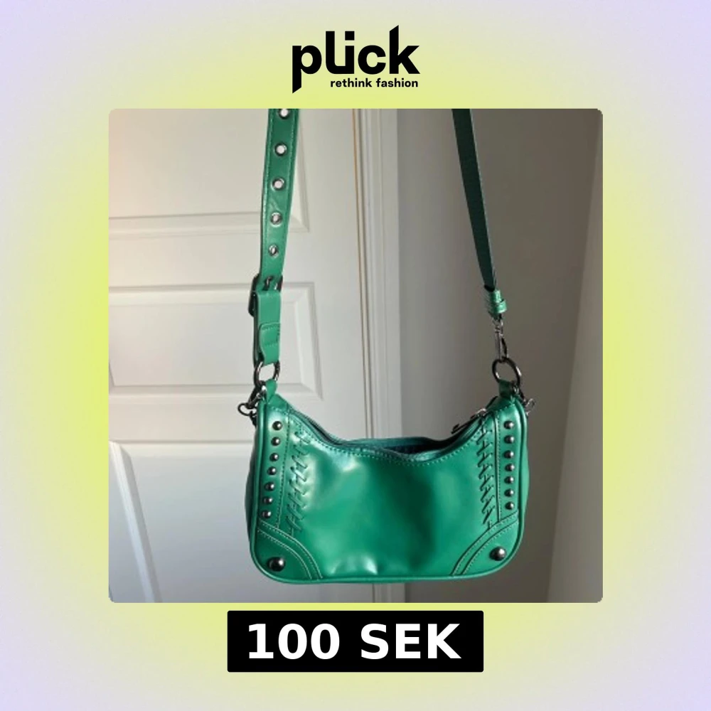 Cool grön axelväska i syntetmaterial med silverfärgade nitar och kedja. Väskan har justerbart axelband med metallringar och dragkedja upptill. Snygga sömdetaljer på framsidan ger extra edge. Perfekt storlek för det viktigaste och en riktigt trendig look.