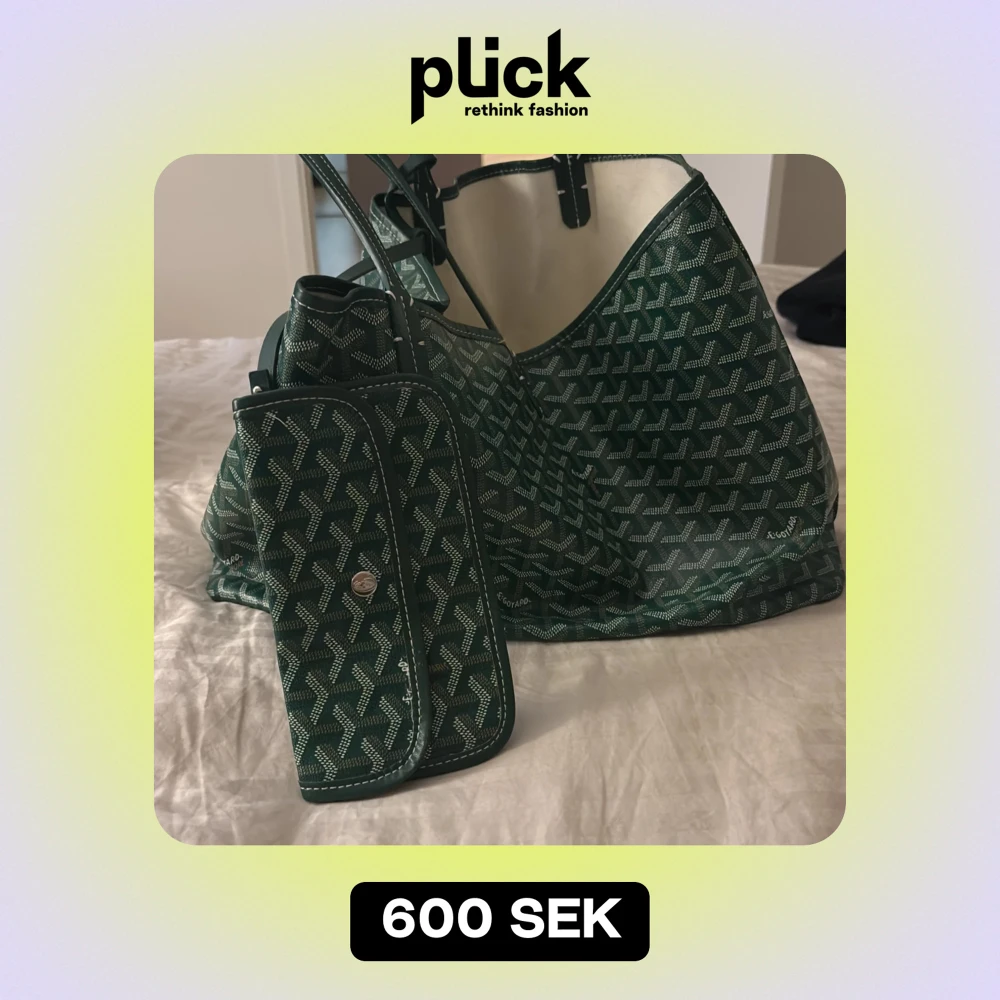 Säljer en snygg grön väska med ett unikt mönster. Den har en matchande liten plånbok med knappstängning. Perfekt för både vardag och speciella tillfällen. Väskan har bekväma handtag och är rymlig nog för alla dina nödvändigheter. OBS Priset kan diskuteras!