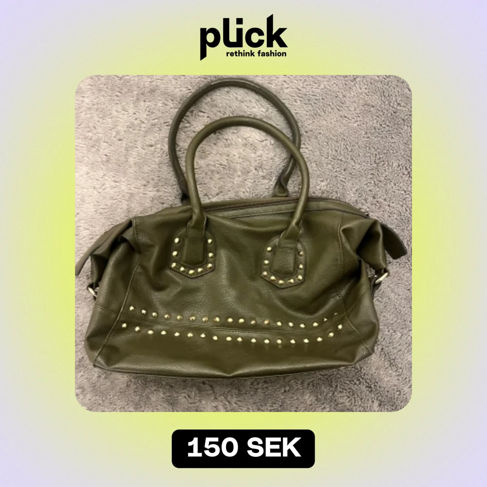 Jättecool grön handväska med guldiga nitar, som tyvärr inte kommer till användning. Jättefint skick och väldigt rymlig!