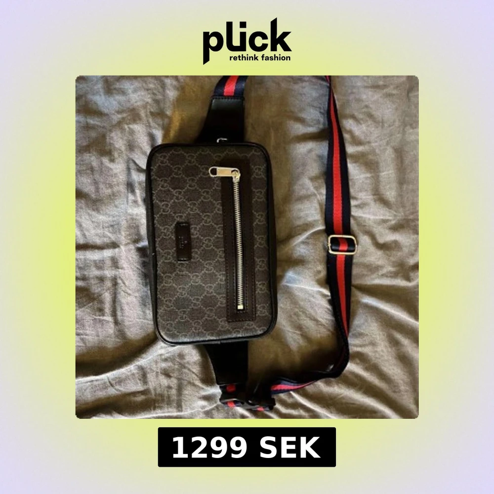 Säljer en svart axelväska från gucc! med klassiskt GG-mönster och justerbar rem i rött och marinblått. Väskan har en silverfärgad dragkedja framtill och detaljer i skinn. Perfekt för att bära det viktigaste med stil.