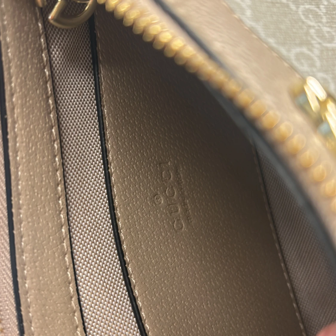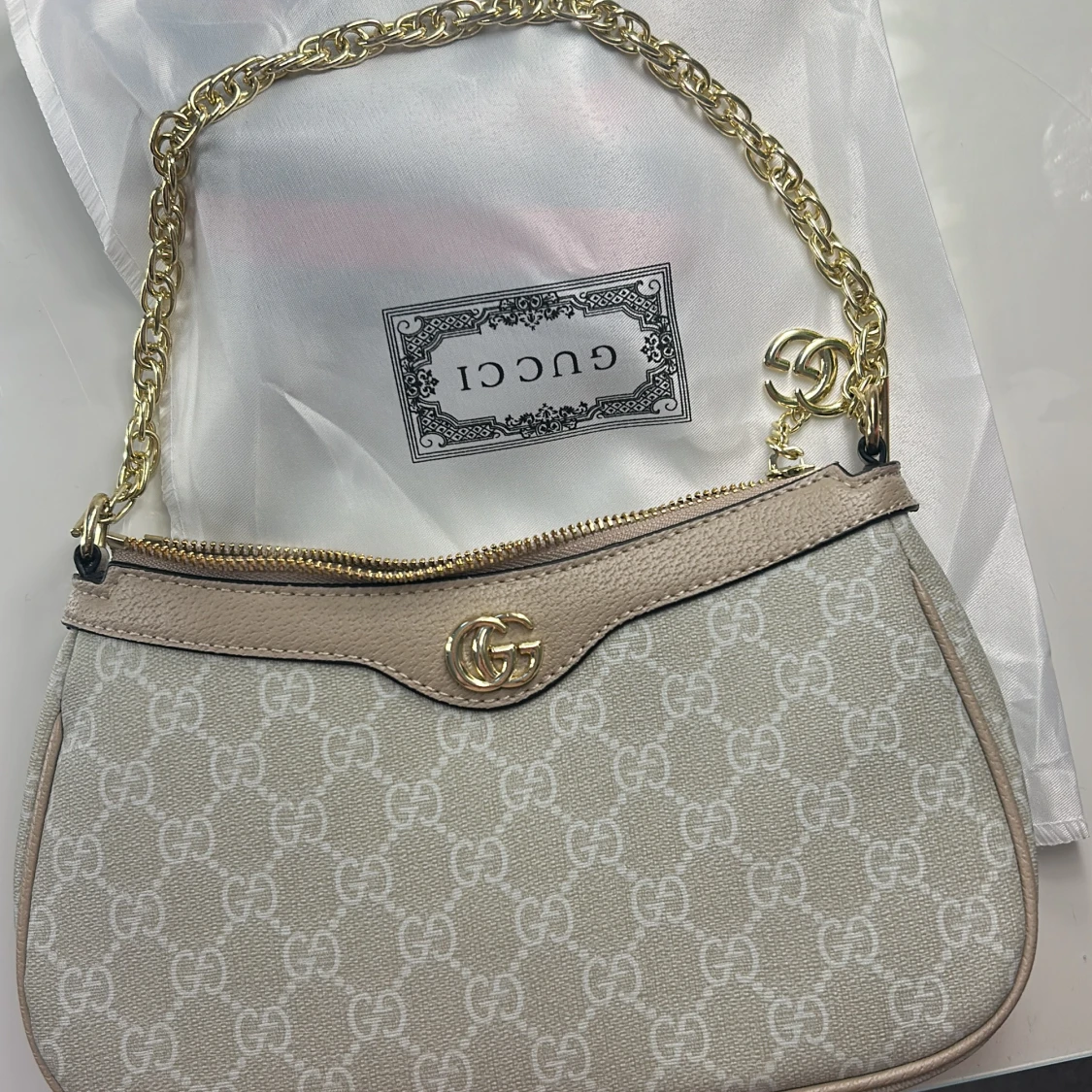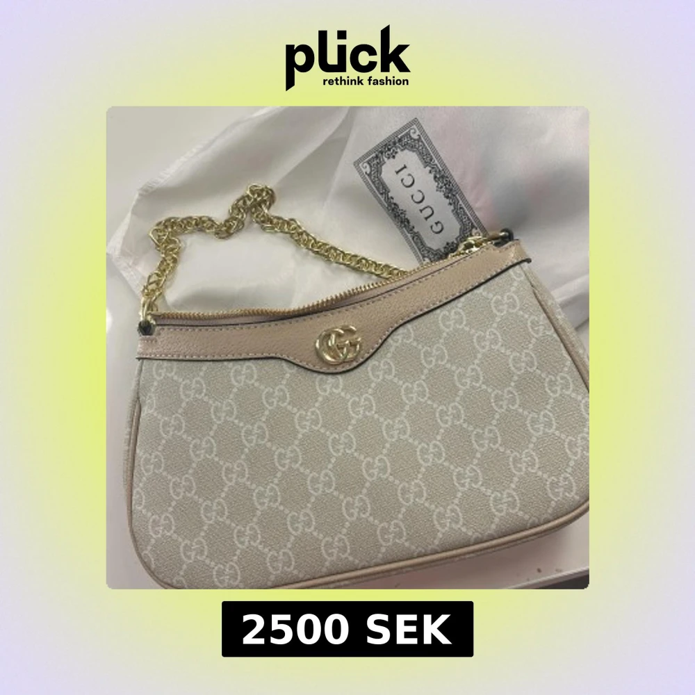 Säljer en snygg beige axelväska från Gucci med klassiskt GG-mönster och guldfärgad kedja. Väskan har dragkedja upptill och detaljer i skinn. Perfekt storlek för det viktigaste och en riktigt trendig accessoar.