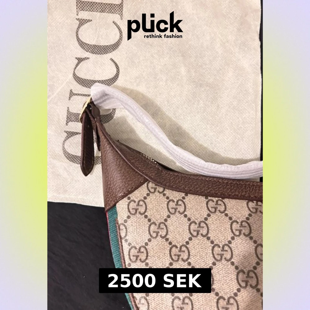 Snygg axelväska från Gucci med klassiskt GG-mönster i beige och brunt. Väskan har bruna skinn-detaljer, guldfärgad GG-logga och dragkedja. Sidan har röd och grön rand. Perfekt för dig som vill ha en ikonisk designeraccessoar med lyxig känsla.