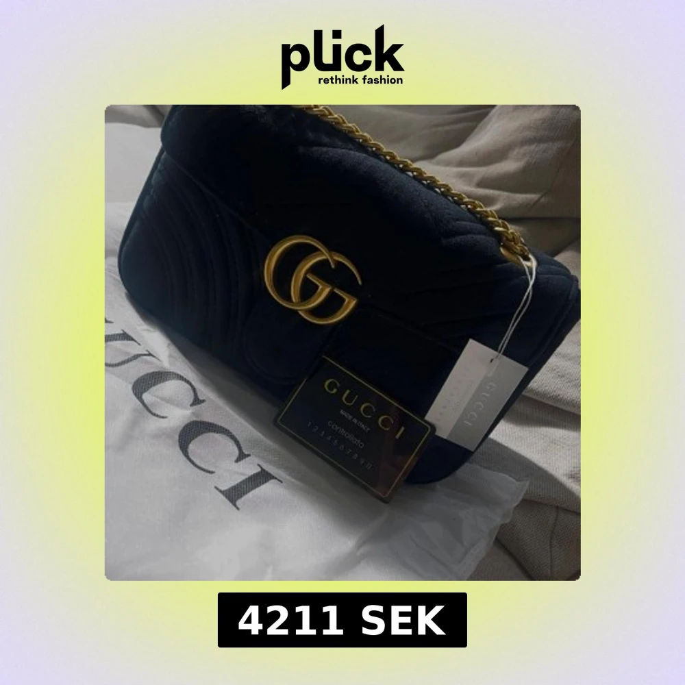 Supersnygg svart axelväska från Gucci i lyxig sammet med ikoniskt GG-spänne i guld och kedjerem. Väskan har quiltad design och är perfekt för dig som vill ha en statement piece med exklusiv känsla.