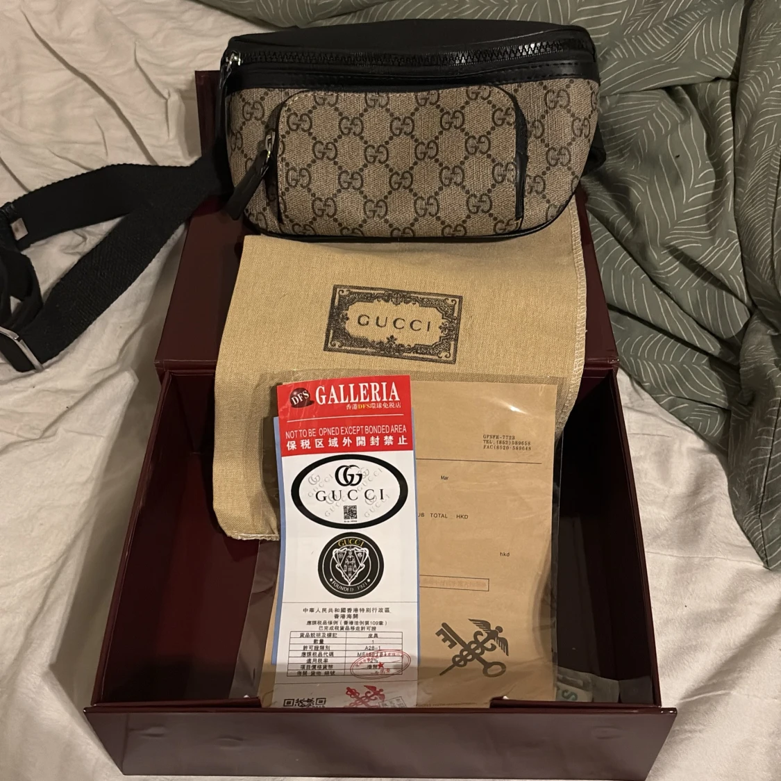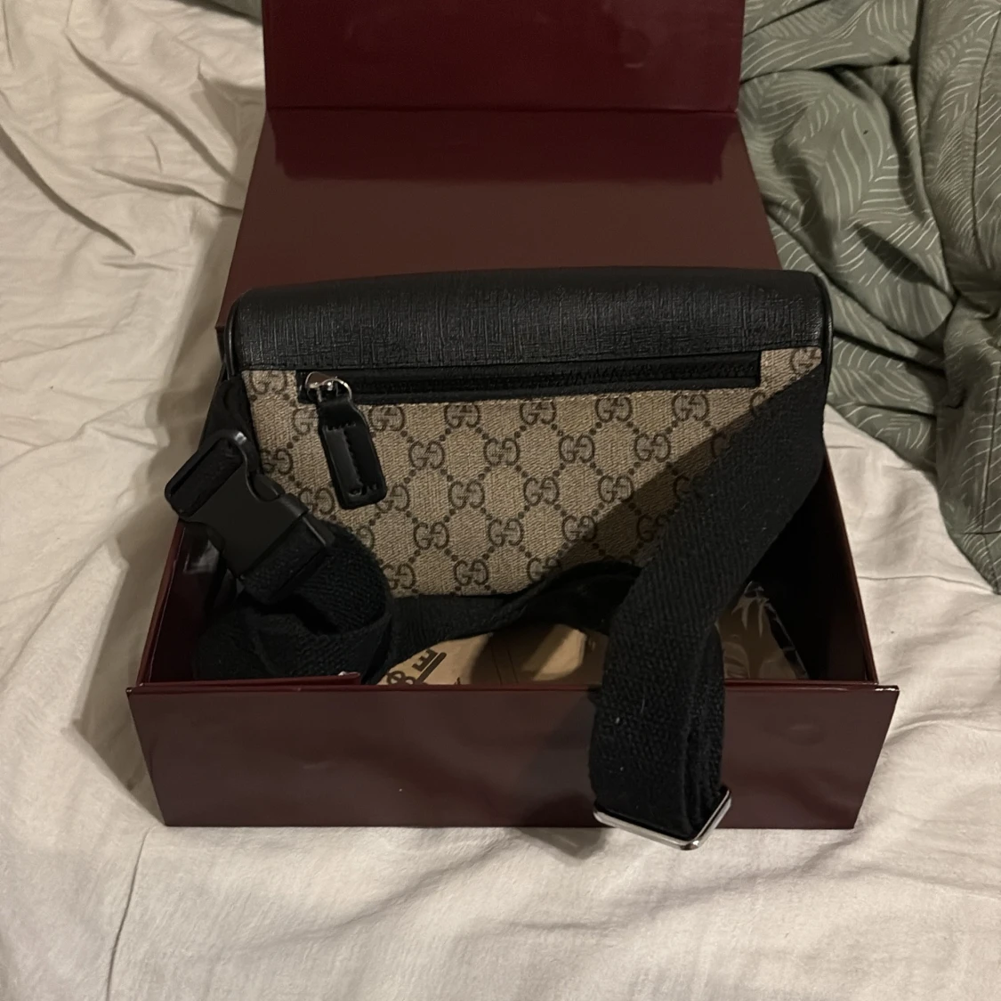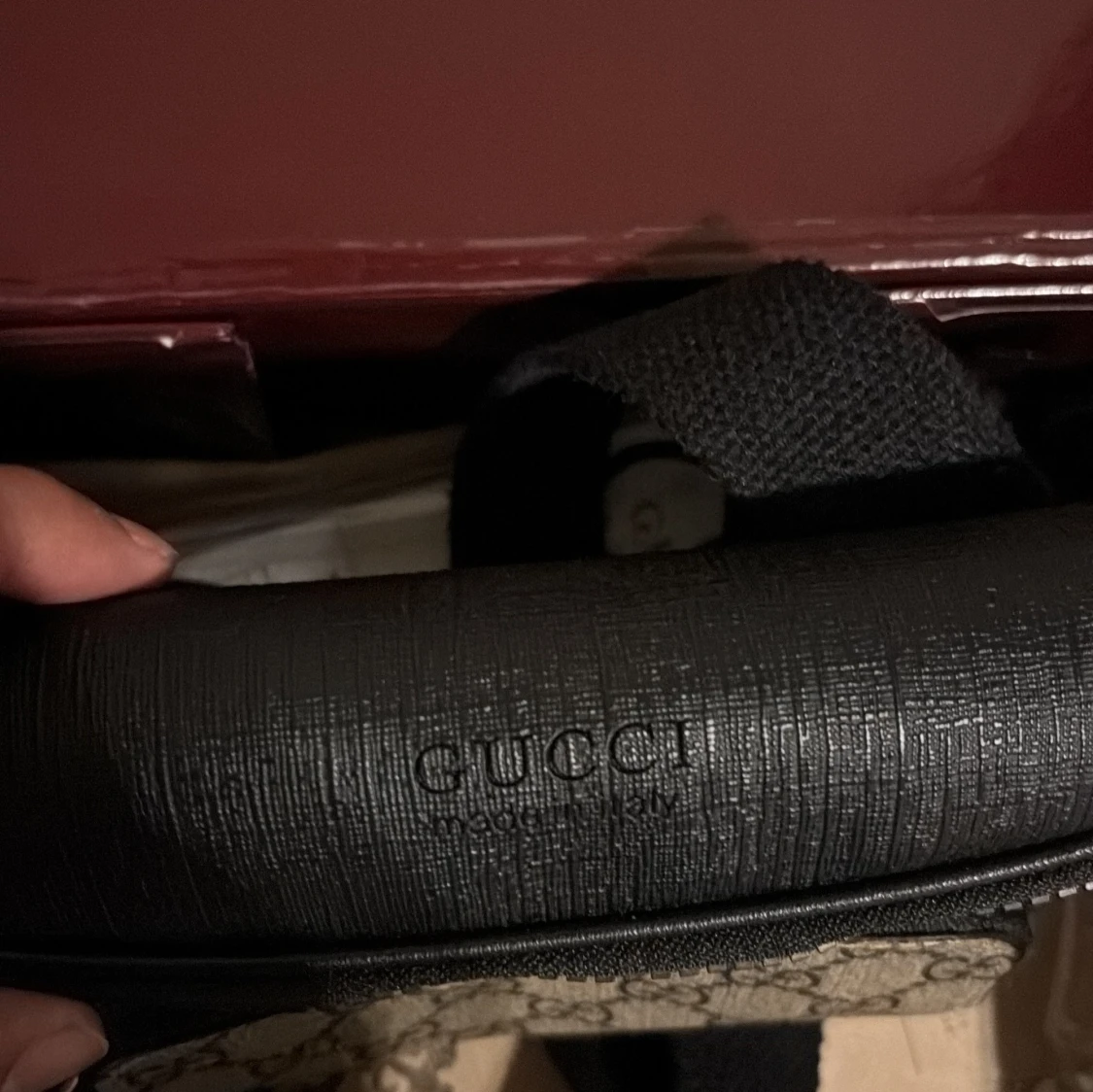 Snygg axelväska från Gucci i beige och svart med klassiskt GG-mönster. Väskan har svarta skinn- och textildetaljer, justerbar rem och flera dragkedjefack. Perfekt för dig som vill ha en stilren och lyxig accessoar med tydlig logga.