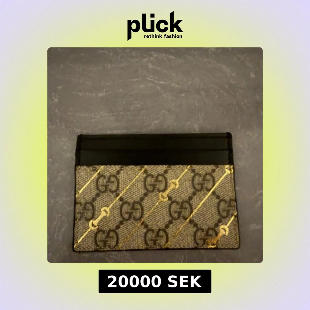 Säljer en snygg och stilren plånbok från Gucci med klassiskt GG Supreme-mönster i beige och svart, dekorerad med diagonala guldiga linjer. Plånboken är tillverkad i skinn och har flera fack för kort. Perfekt för dig som gillar lyxiga accessoarer.