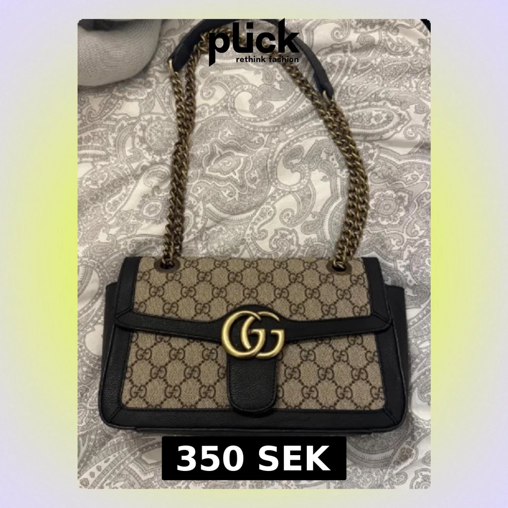 Säljer en snygg axelväska från Gucci med klassiskt GG-mönster i beige och brunt. Väskan har svarta skinnkanter, guldfärgad kedja och stor GG-logga framtill. Insidan har dragkedja och foder i ljus färg. Perfekt för dig som gillar lyxiga detaljer och ikonisk design.