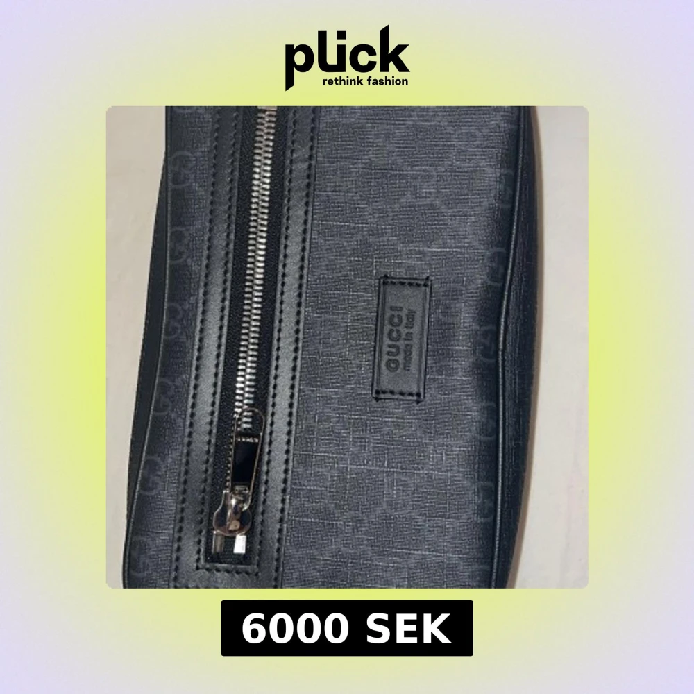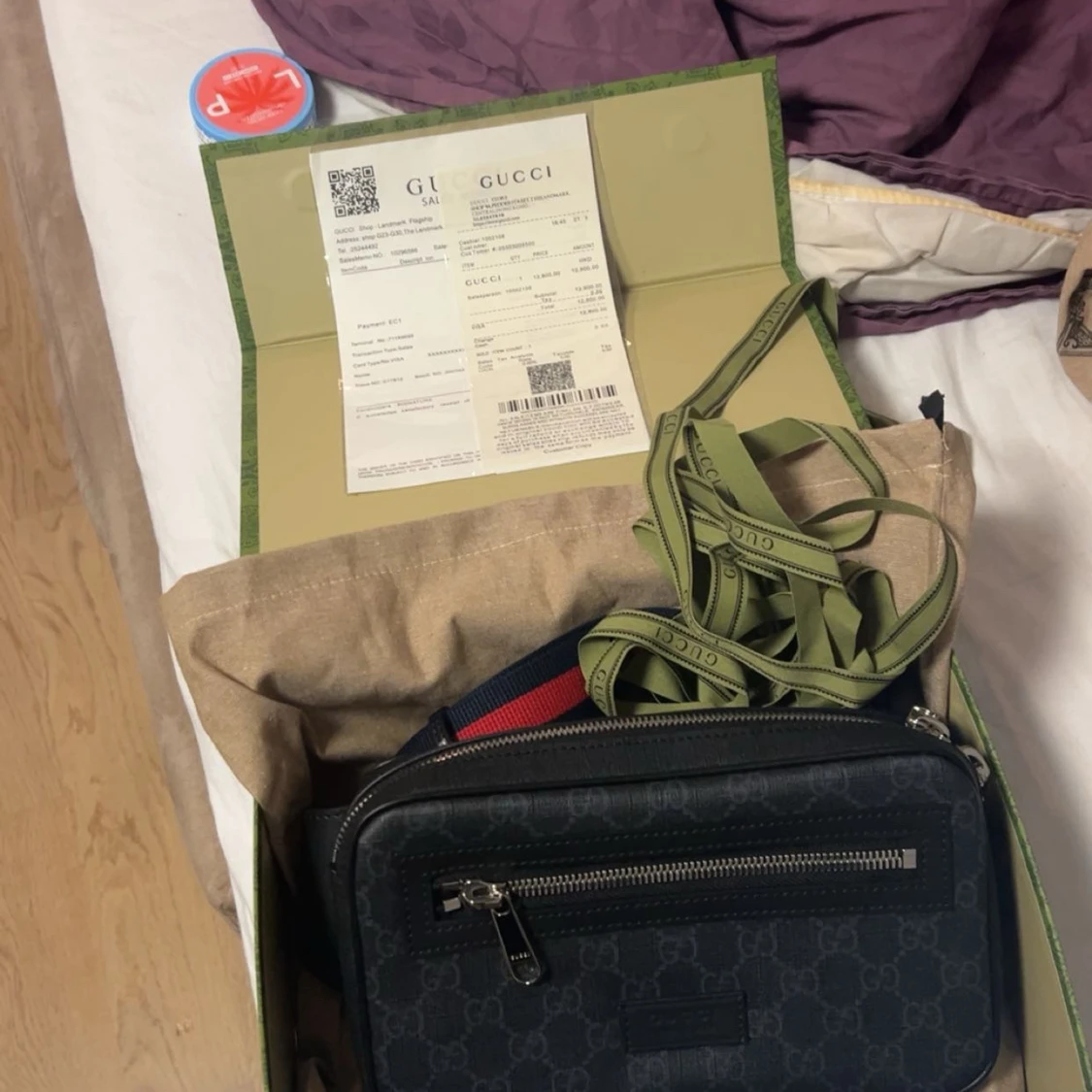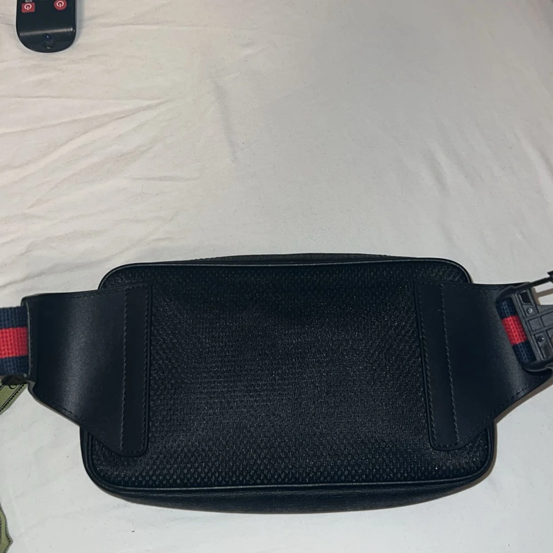 Snygg svart axelväska från Gucci med diskret GG-monogram över hela väskan. Väskan har en silverfärgad dragkedja framtill och bred justerbar axelrem med röd-blå rand. Tillverkad i skinn och textil, perfekt för dig som vill ha en stilren och lyxig accessoar.