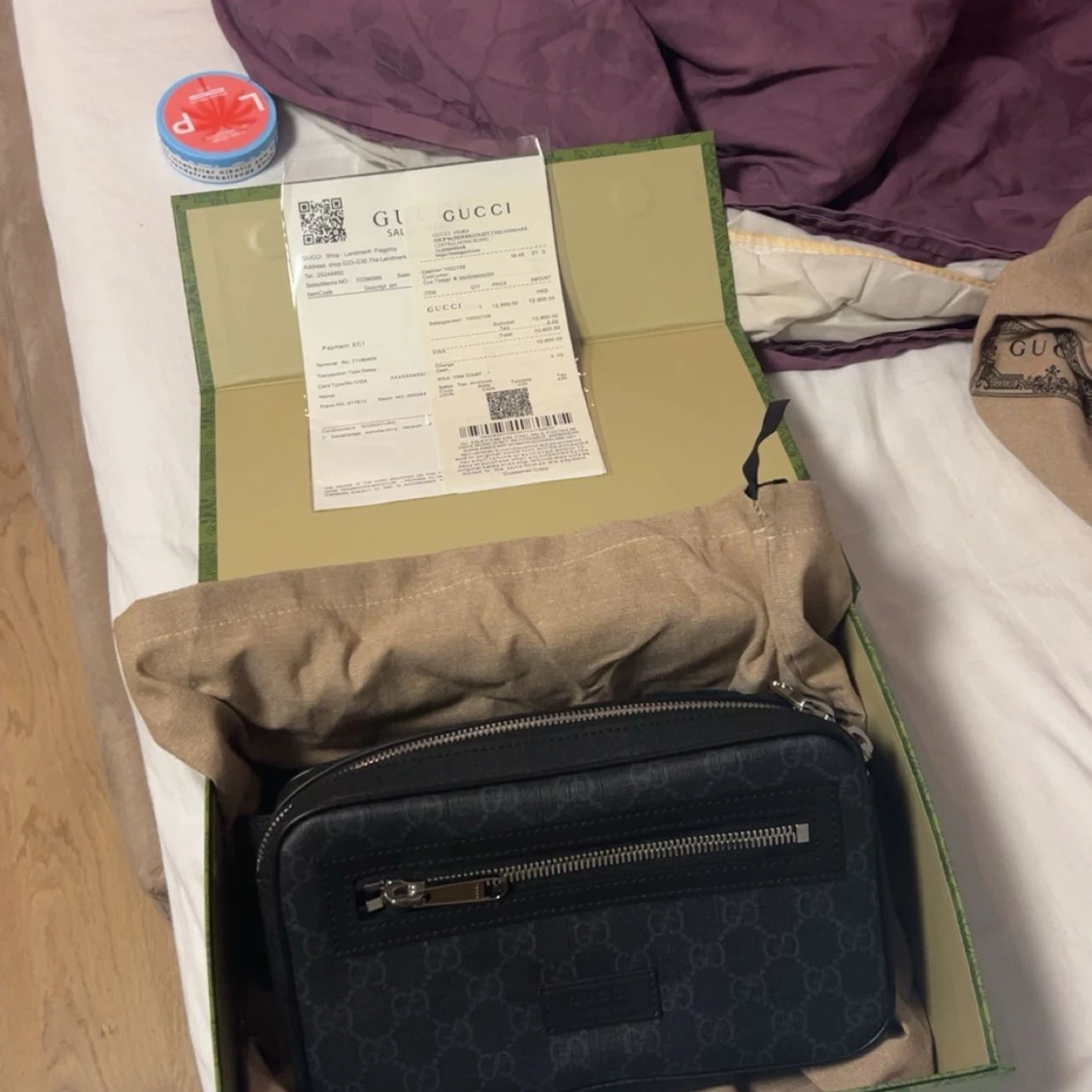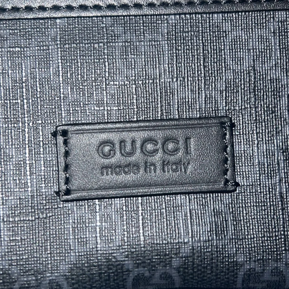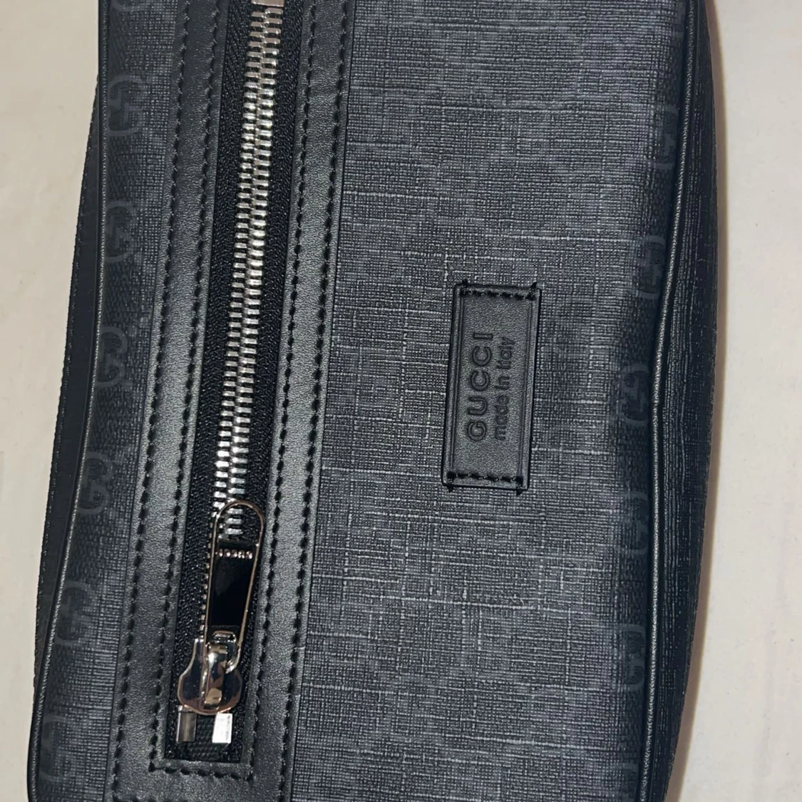 Snygg svart axelväska från Gucci med diskret GG-monogram över hela väskan. Väskan har en silverfärgad dragkedja framtill och bred justerbar axelrem med röd-blå rand. Tillverkad i skinn och textil, perfekt för dig som vill ha en stilren och lyxig accessoar.