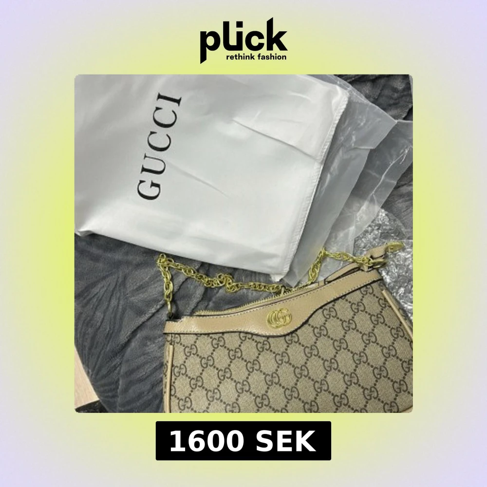 Snygg axelväska från Gucci med klassiskt GG-mönster i beige och brunt. Väskan har guldfärgade detaljer, kedjerem och bruna skinnpartier. Perfekt för dig som vill ha en ikonisk och trendig accessoar med lyxig känsla.