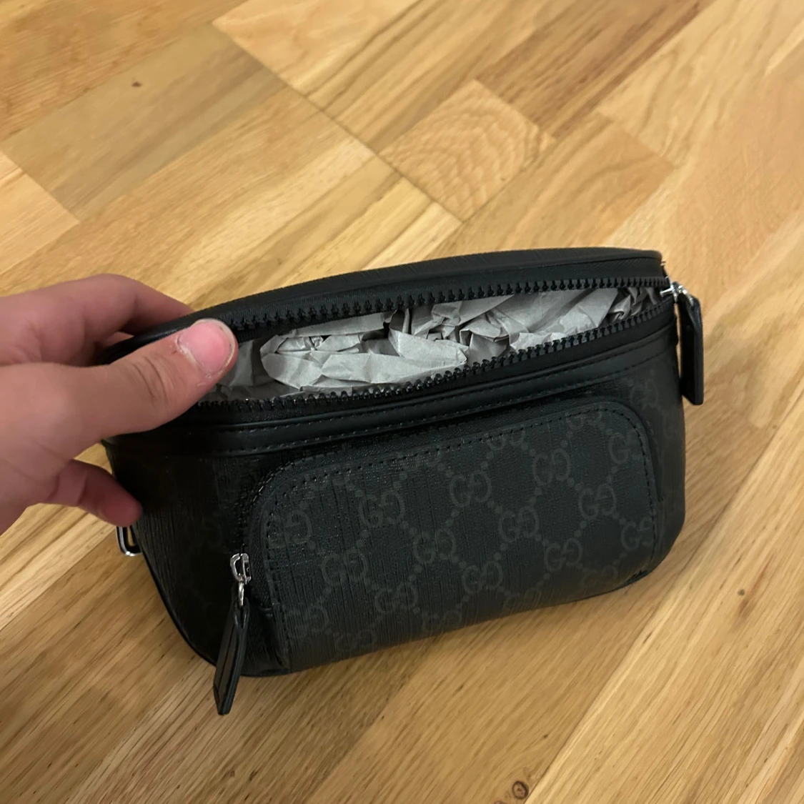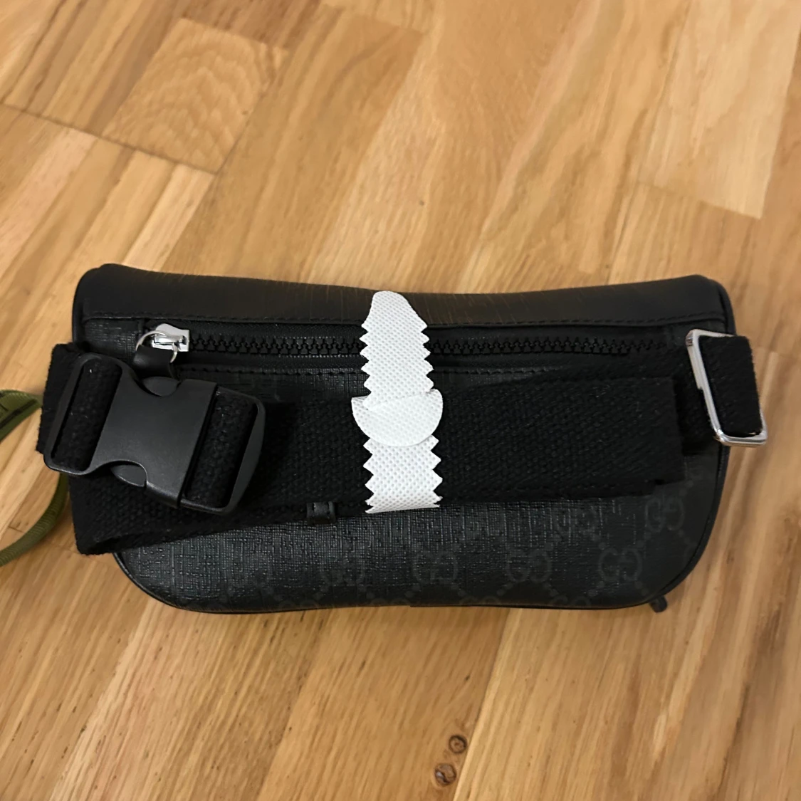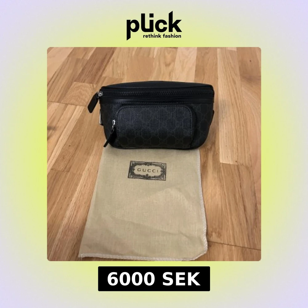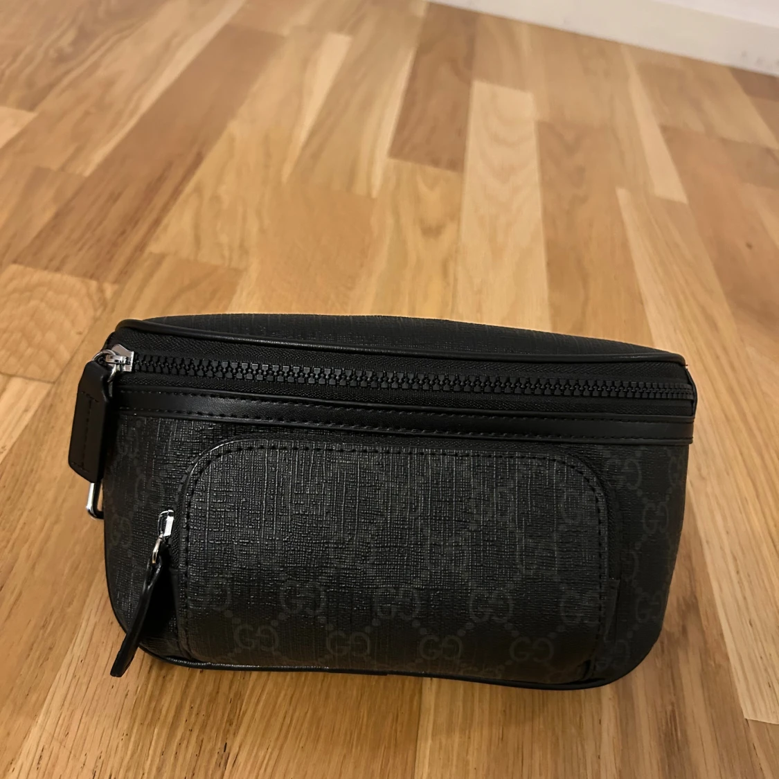 Snygg svart axelväska från Gucci med klassiskt GG-mönster i mörk ton. Väskan har justerbart band, dragkedja upptill och extra fack framtill. Tillverkad i skinn med detaljer i silverfärgad metall. Perfekt för att bära det viktigaste med stil.