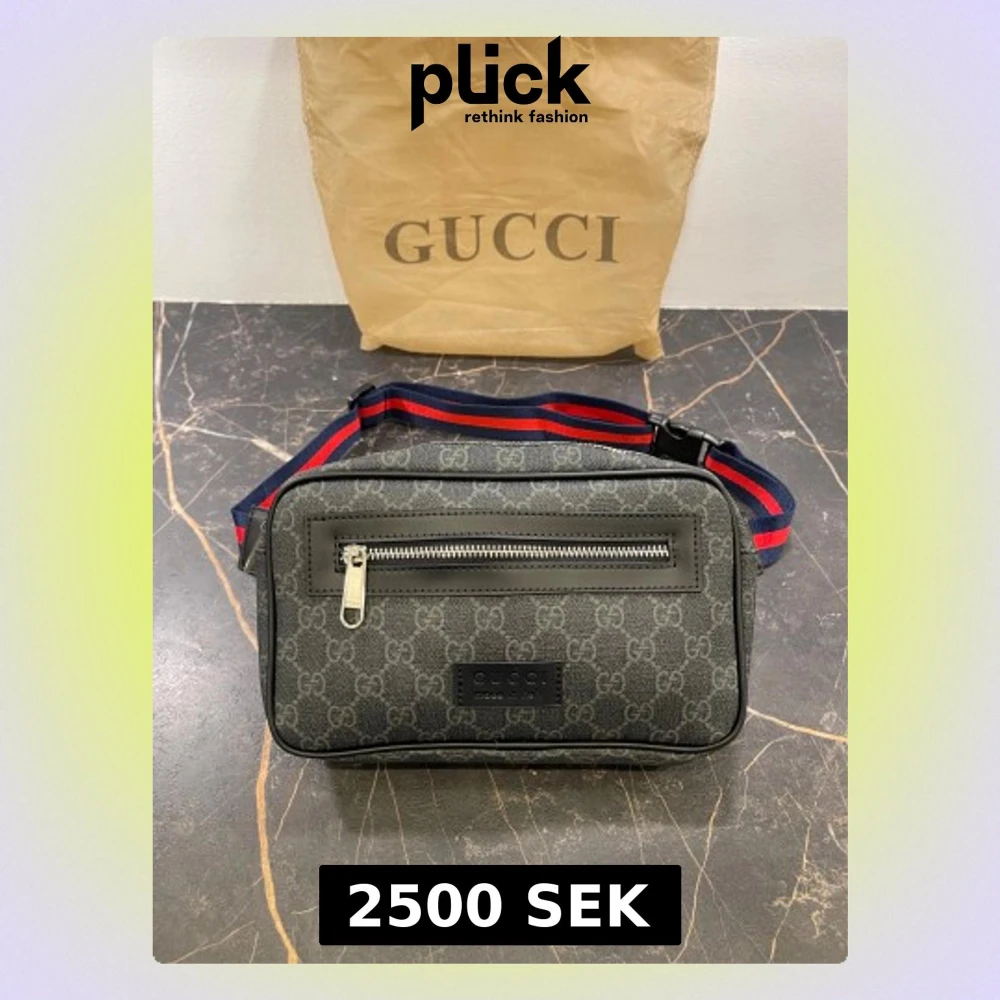 Snygg svart axelväska från Gucci med klassiskt GG-mönster och silverfärgad dragkedja framtill. Väskan har en justerbar axelrem i blått och rött, samt detaljer i skinn. Perfekt storlek för det viktigaste och stilren design med logotyp på framsidan.