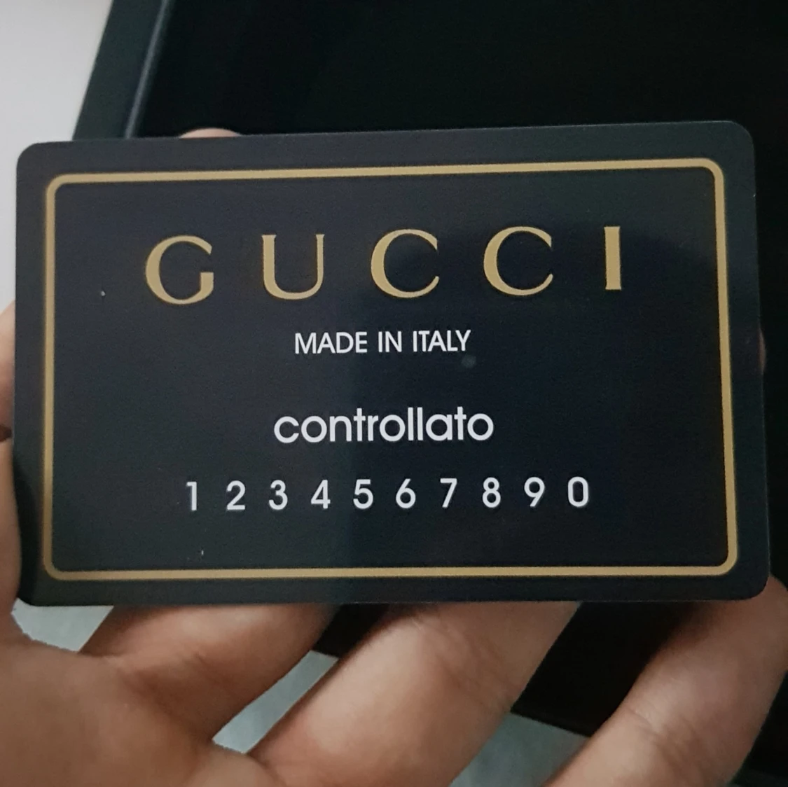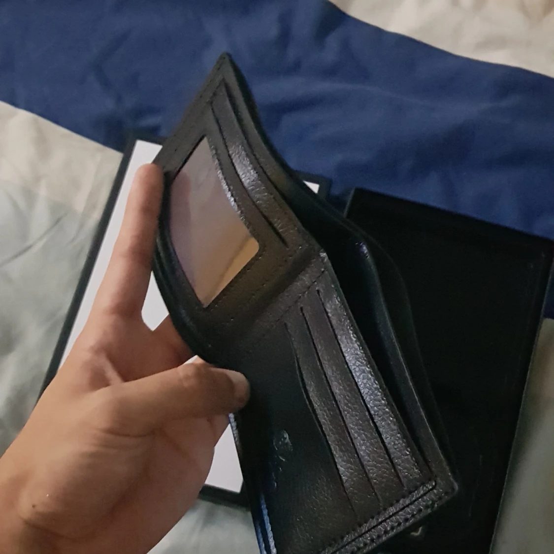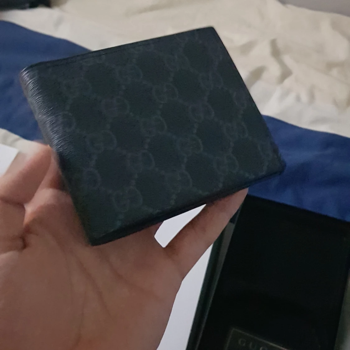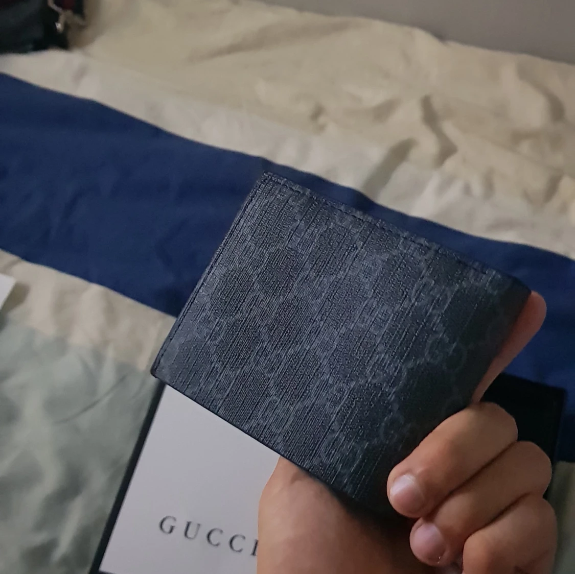 Snygg svart plånbok från Gucci med klassiskt GG-mönster över hela ytan. Plånboken är tillverkad i skinn och har flera fack för kort samt ett fönster för ID. Kommer i originalask med kontrollkort. Perfekt för dig som gillar stilrena accessoarer.