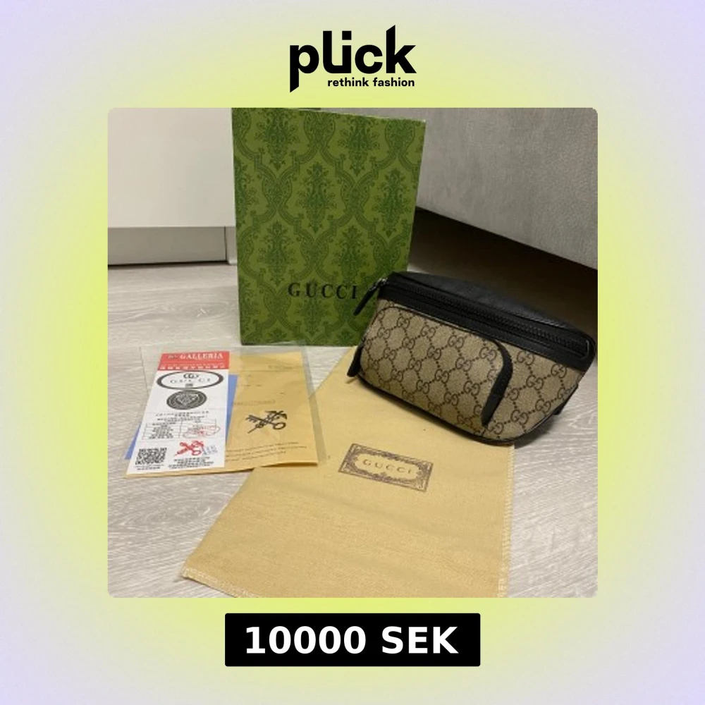 Säljer en snygg beige Gucci väska med klassiskt GG-mönster och svarta skinn-detaljer. Väskan har dragkedja upptill och ett extra fack framtill. Perfekt för dig som vill ha en stilren och lyxig accessoar.