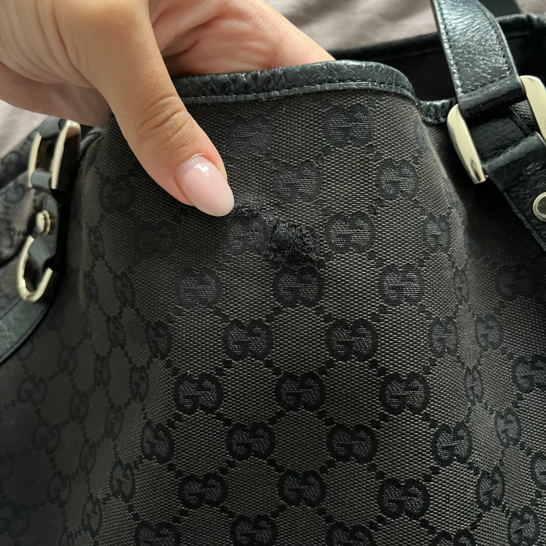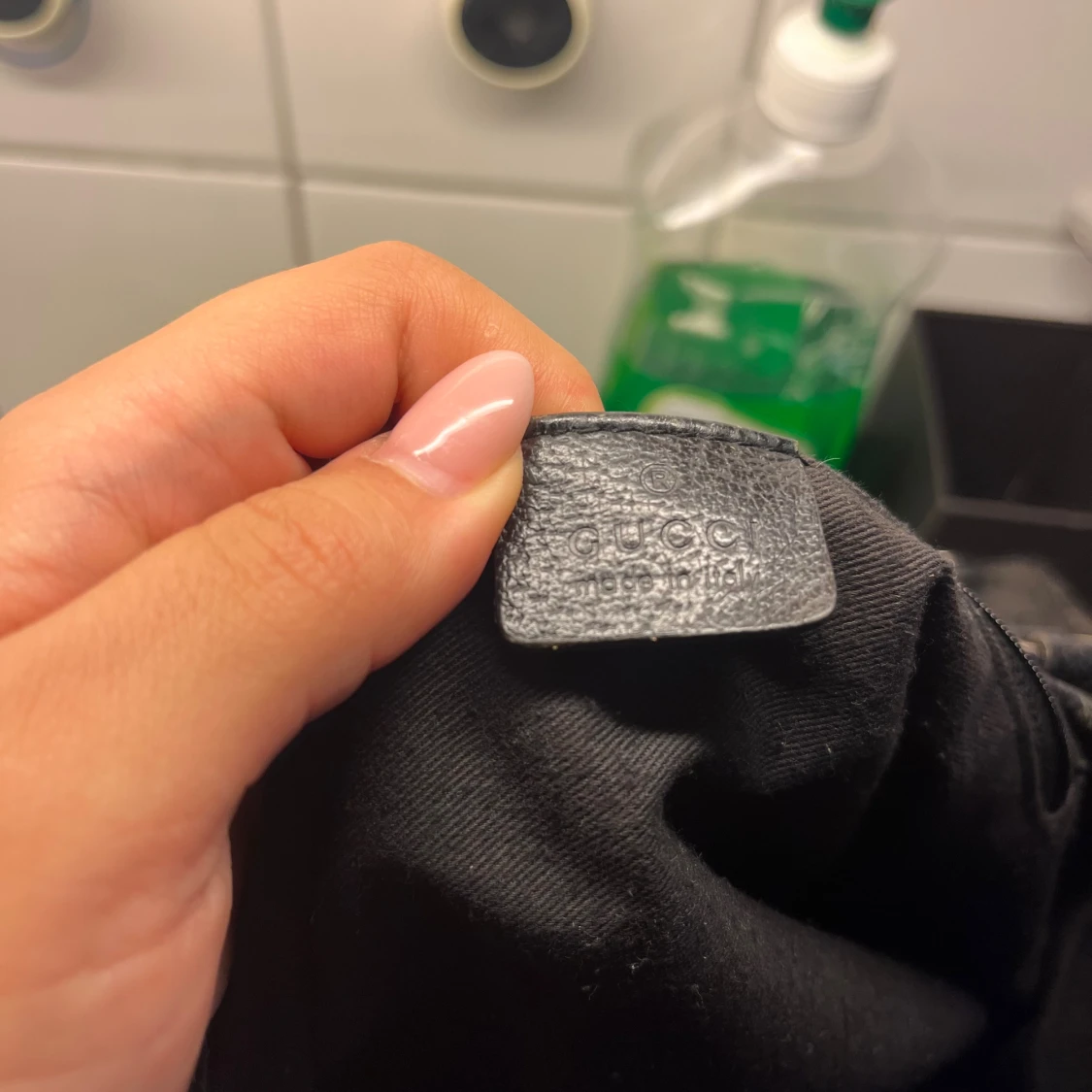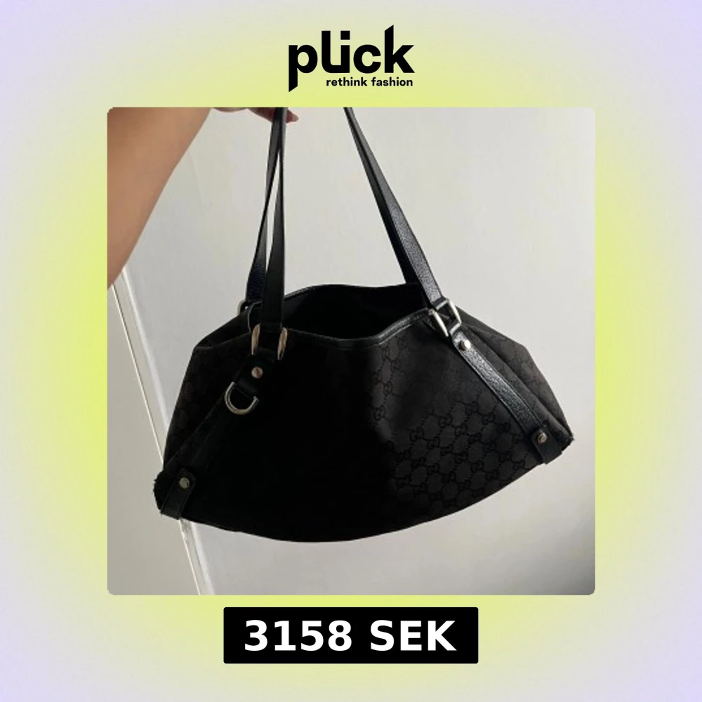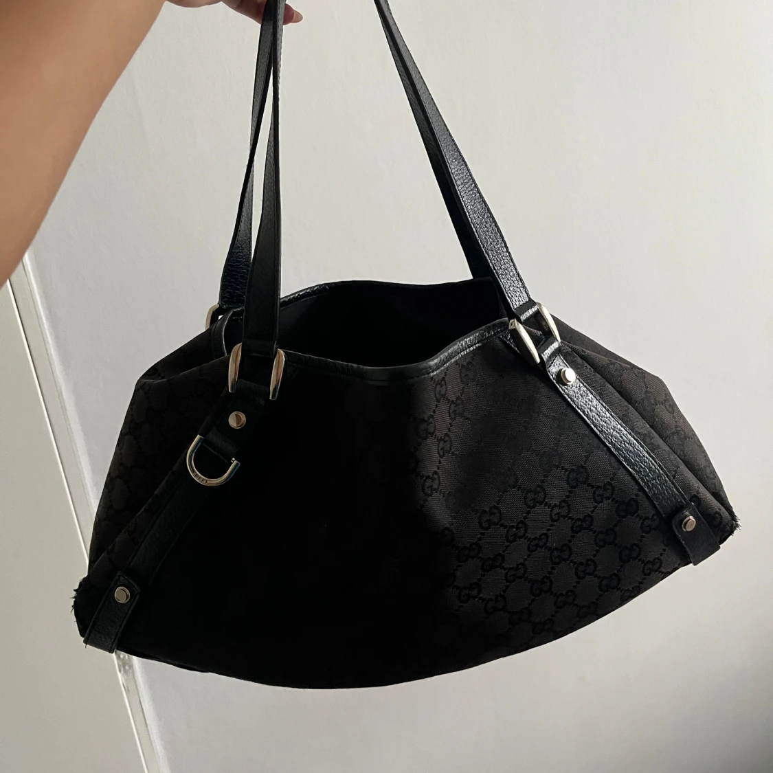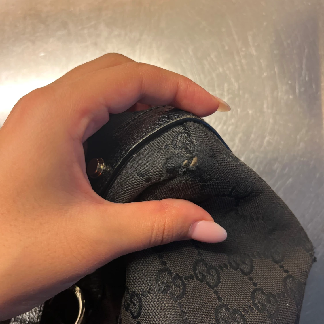 Säljer en svart axelväska från Gucci med klassiskt GG-mönster. Väskan har detaljer i skinn och silverfärgade metalldelar. Rymlig modell med dubbla axelband och snygg form, perfekt för dig som gillar lyxiga accessoarer med ikonisk design.
