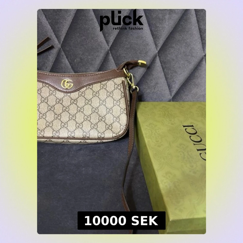Säljer en snygg beige och brun handväska från Gucci med klassiskt GG-mönster och guldfärgade detaljer. Väskan har en avtagbar axelrem och dragkedja upptill. Perfekt för dig som vill ha en ikonisk accessoar med lyxig känsla.