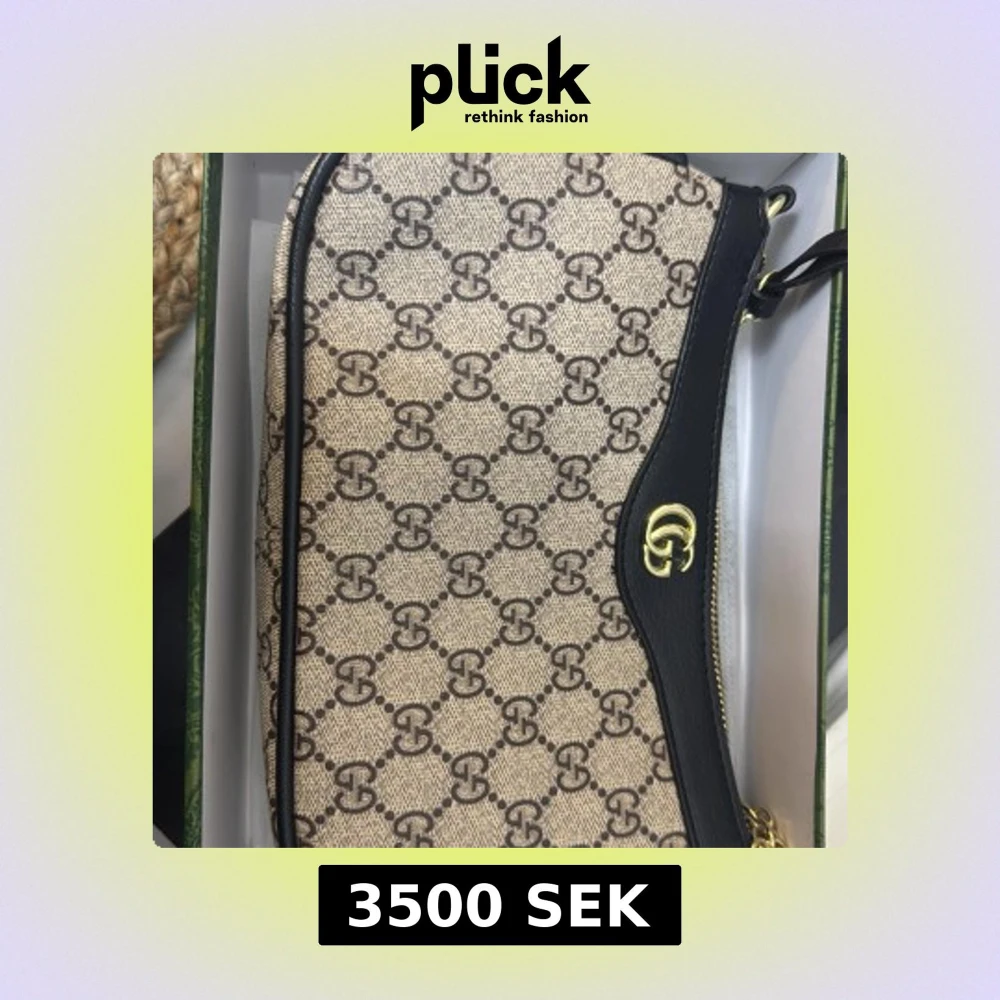 Säljer en beige axelväska från Gucci med klassiskt GG-mönster och svarta skinn-detaljer. Väskan har guldfärgad logga och dragkedja upptill. Perfekt för dig som vill ha en stilren och lyxig accessoar.