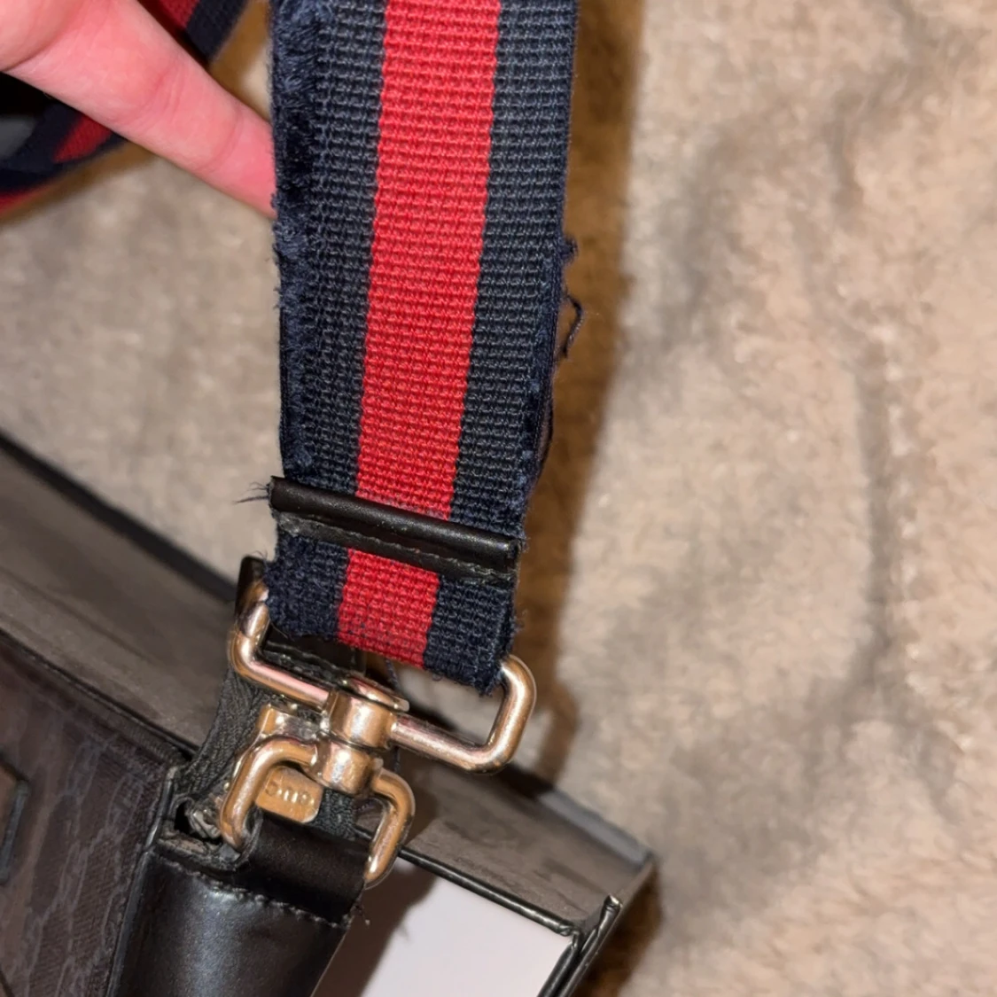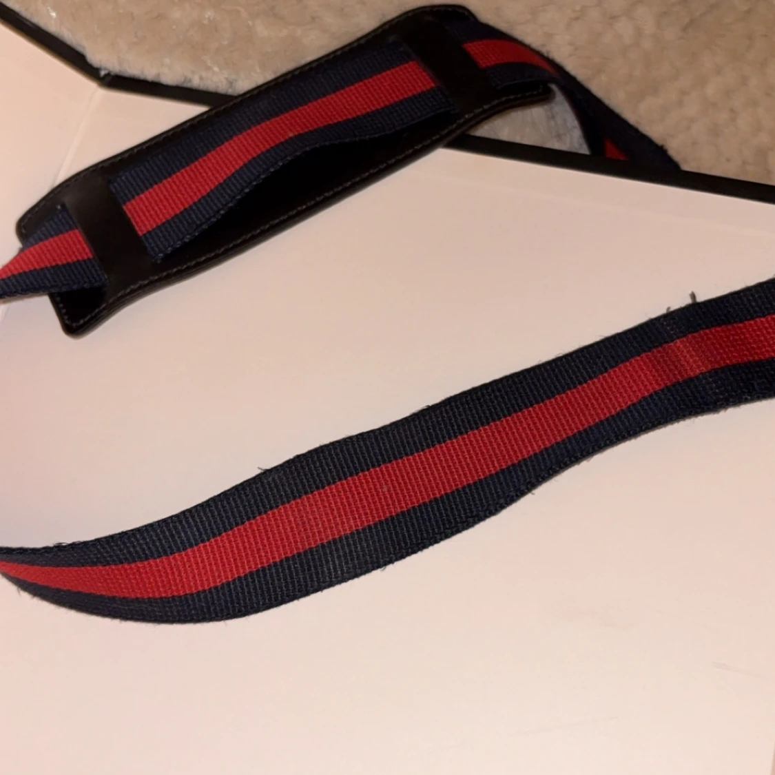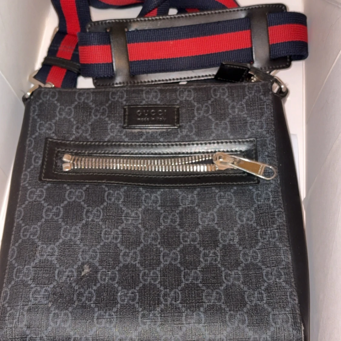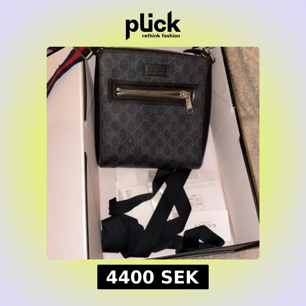 Snygg svart axelväska från Gucci med klassiskt GG-mönster och silverfärgad dragkedja framtill. Väskan har en bred axelrem i marinblått och rött, samt detaljer i skinn. Perfekt för dig som vill ha en stilren och ikonisk accessoar…. Måste gå till skräddaren klippa bort lite av bandet inget som är wow stort kostar 100kr eller under hundra spänn äkta kvitto finns till äkta allt ingår till väskan plus som sagt den måste fixas det syns på bilderna rakt o tydligt så läs innan du köper