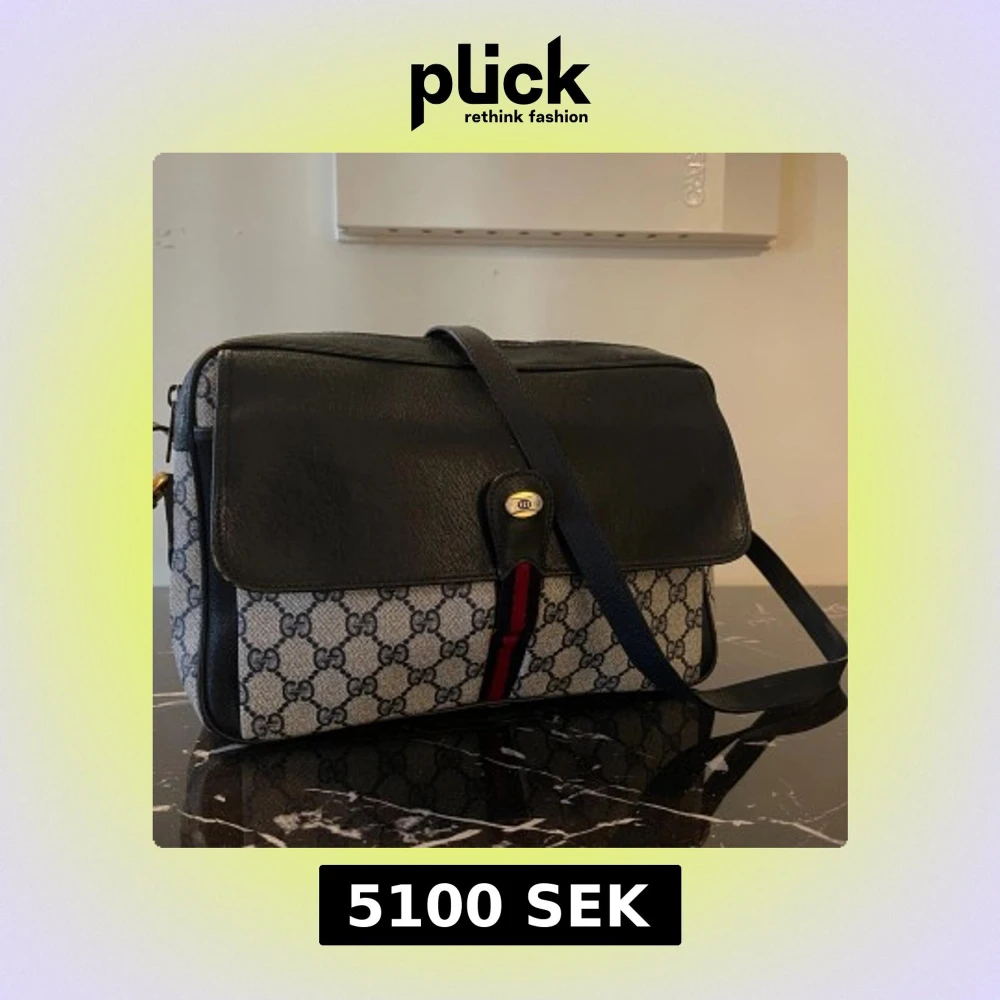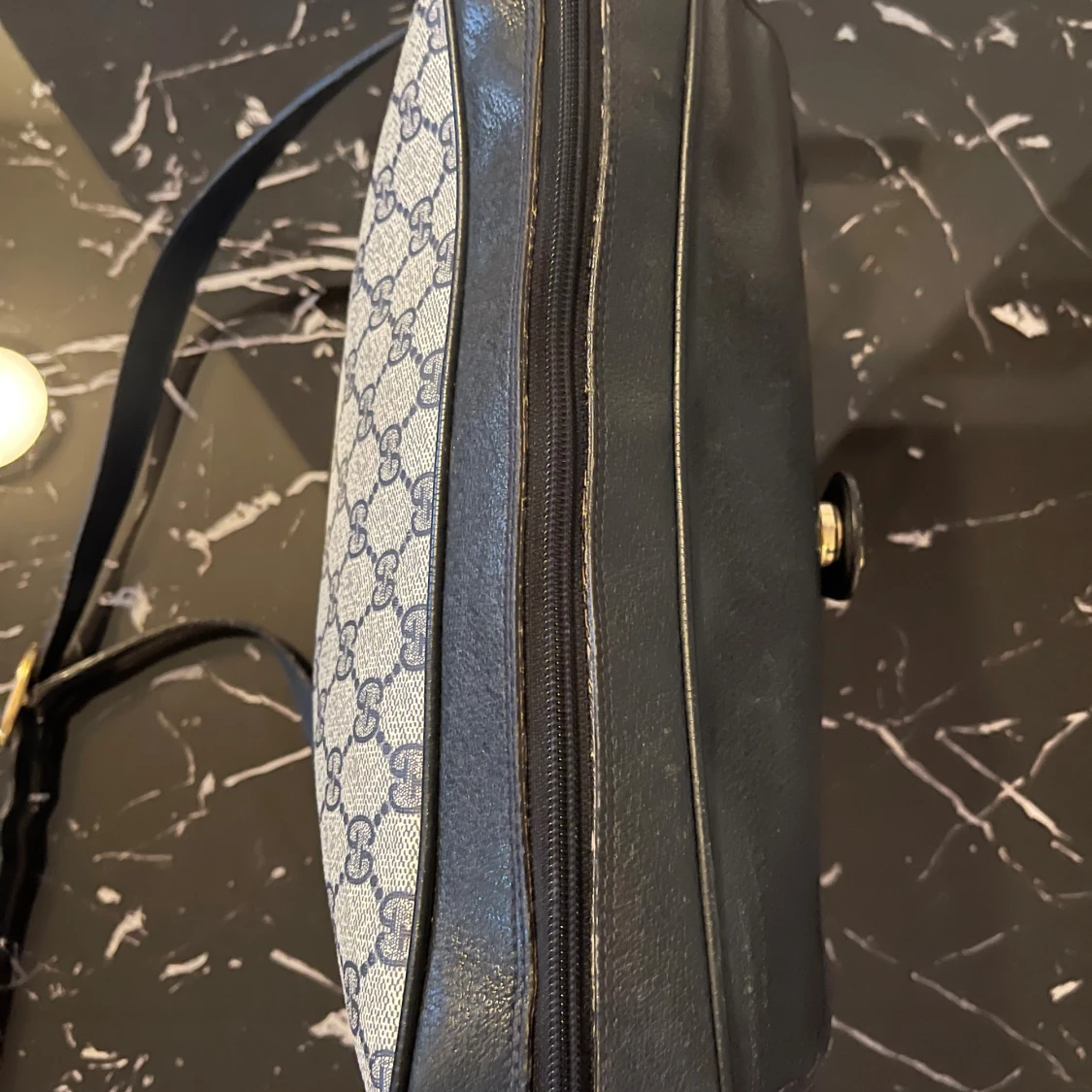 Snygg axelväska från Gucci med klassiskt GG-mönster i grått och svart canvas, detaljer i svart skinn och en röd/blå rand framtill. Väskan har justerbar axelrem, guldfärgad spänndetalj och dragkedja upptill. Perfekt för dig som gillar ikoniska designeraccessoarer.