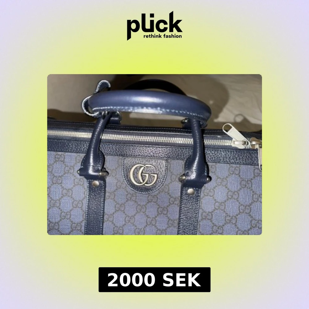 Snygg blå resväska från Gucci med klassiskt GG-mönster och silverfärgade detaljer. Väskan har både handtag och justerbar axelrem, dragkedja upptill samt medföljande lås och nycklar. Tillverkad i canvas och skinn för en lyxig känsla.