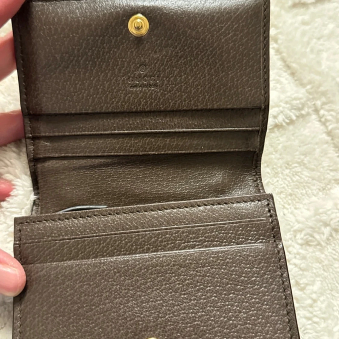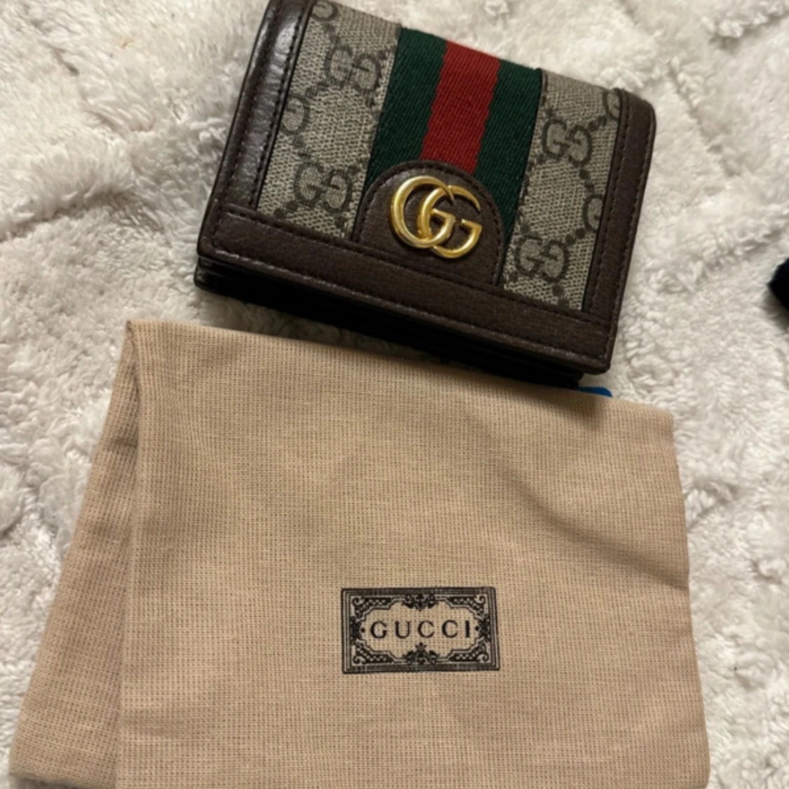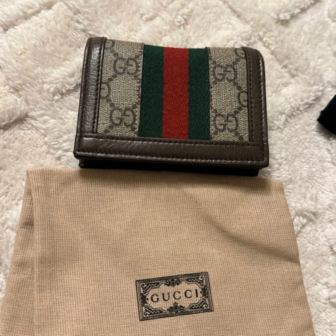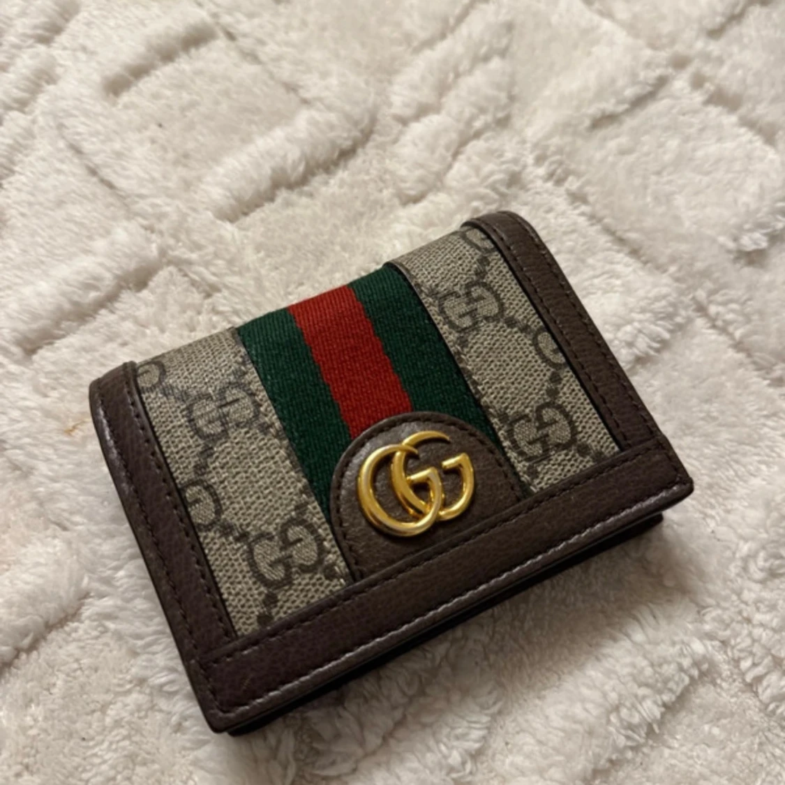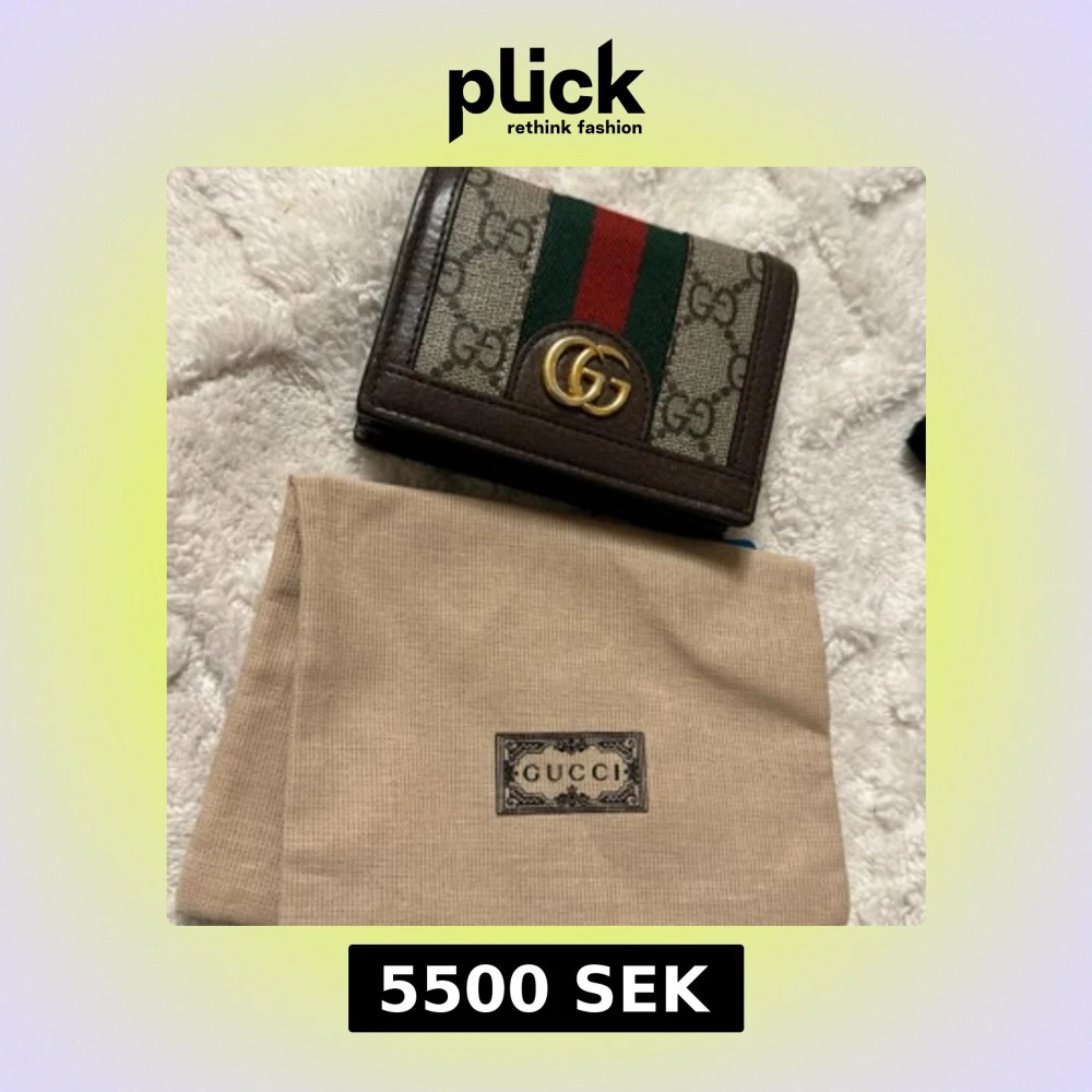 Snygg plånbok från Gucci i brunt skinn med klassiskt GG-monogram och gröna/röda ränder. Guldigt GG-emblem framtill och flera kortfack inuti. Perfekt accessoar för dig som gillar lyxiga detaljer och ikonisk design.