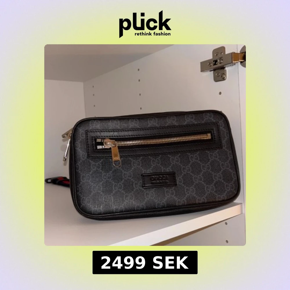 Snygg svart axelväska från Gucci med ett diskret mönster och silverfärgade dragkedjor. Väskan har en justerbar rem i rött och blått, perfekt för en stilren look. Den har flera fack för enkel organisering. Helt äkta. Pris kan diskuteras.